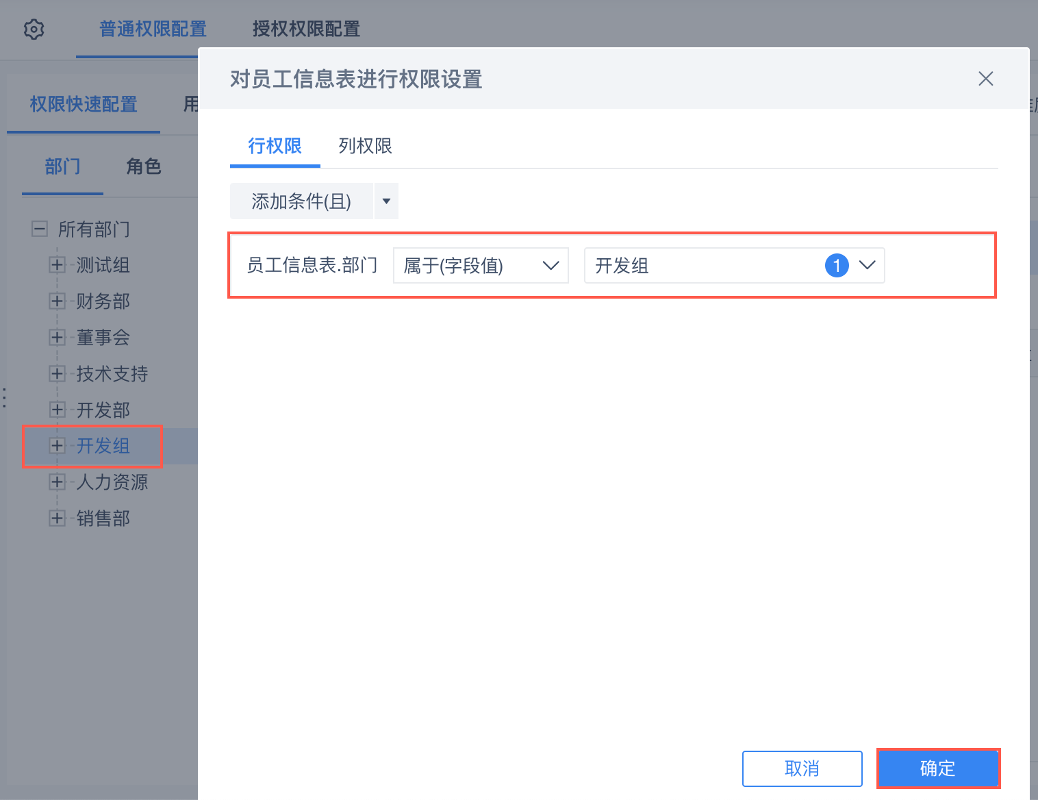 4)对整个开发组分配员工信息表的权限,添加行权限为员工信息表.部门=开发组,如下图所示: