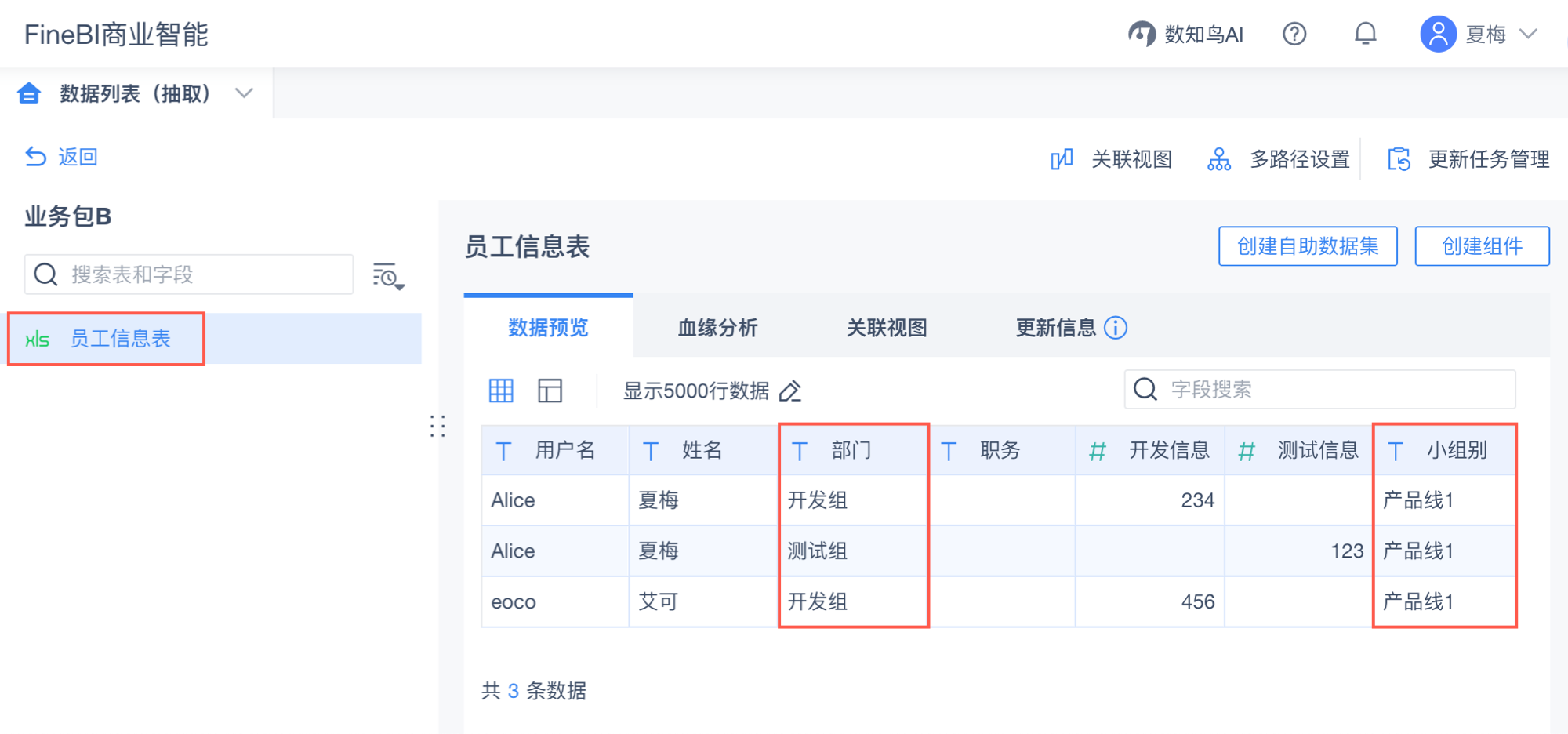 Alice 登录FineBI系统查看「员工信息表」,Alice 可以看到产品线 1 测试组和产品线 1 开发组的数据,如下图所示: