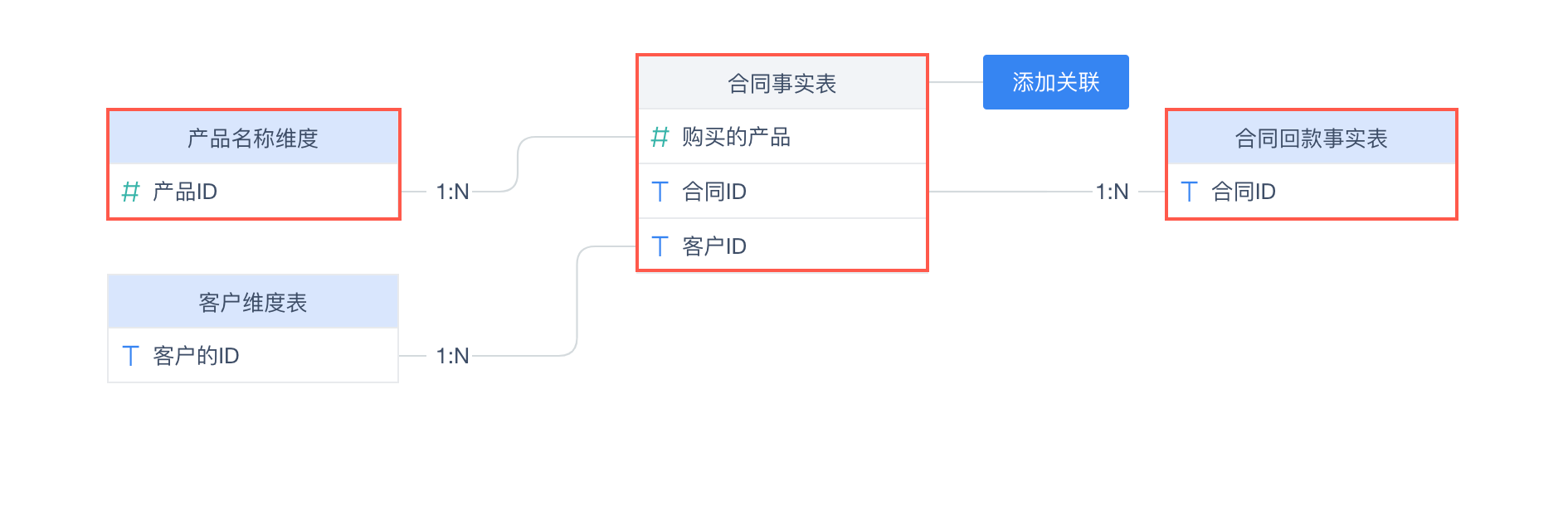 例:现有三张表:「产品名称维度表」、「合同事实表」、「客户维度表」,关联关系如下图所示: