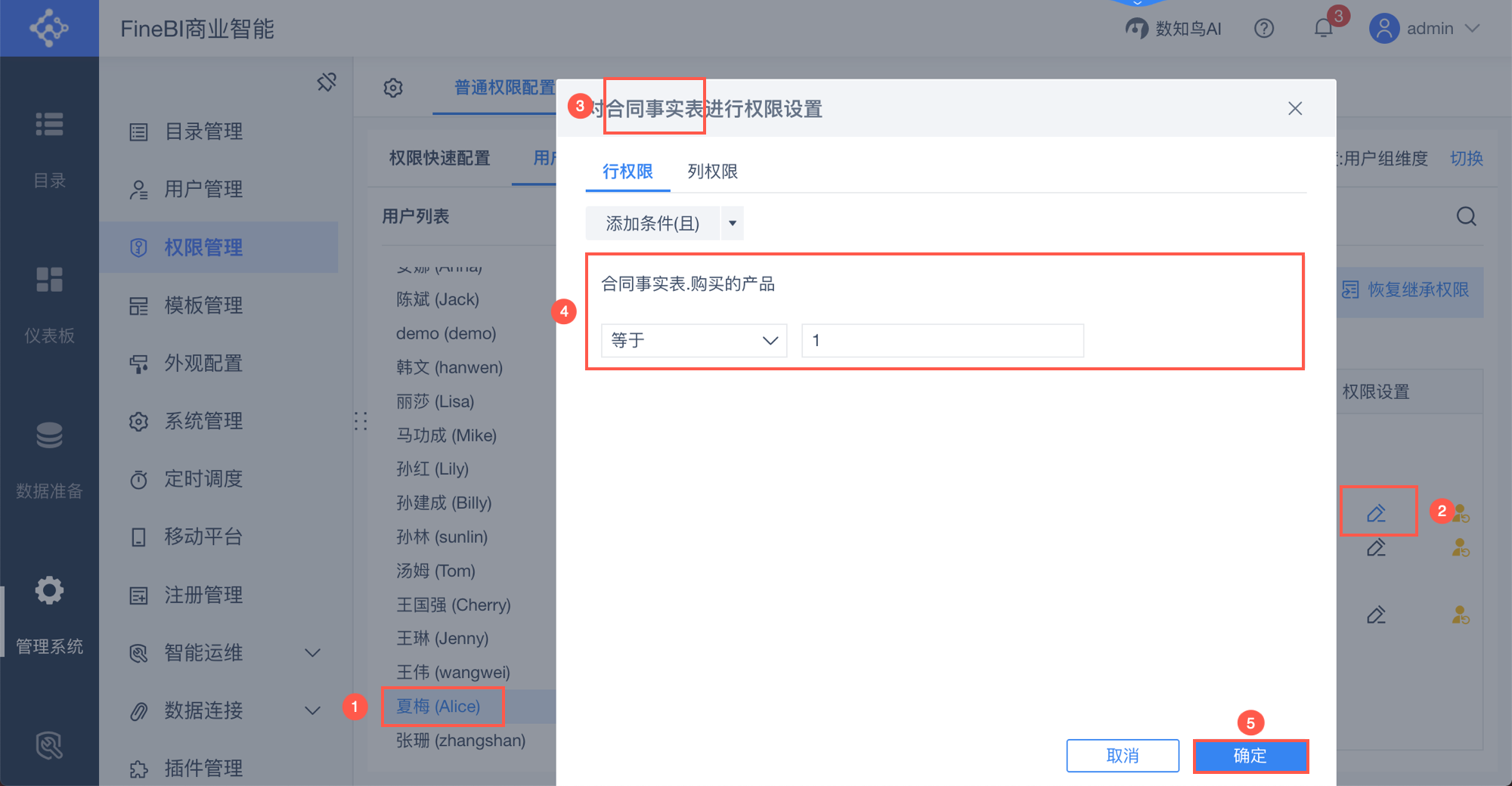 3)管理员对业务包 A 设置「合同事实表」行权限,购买的产品等于「1」 ,如下图所示: