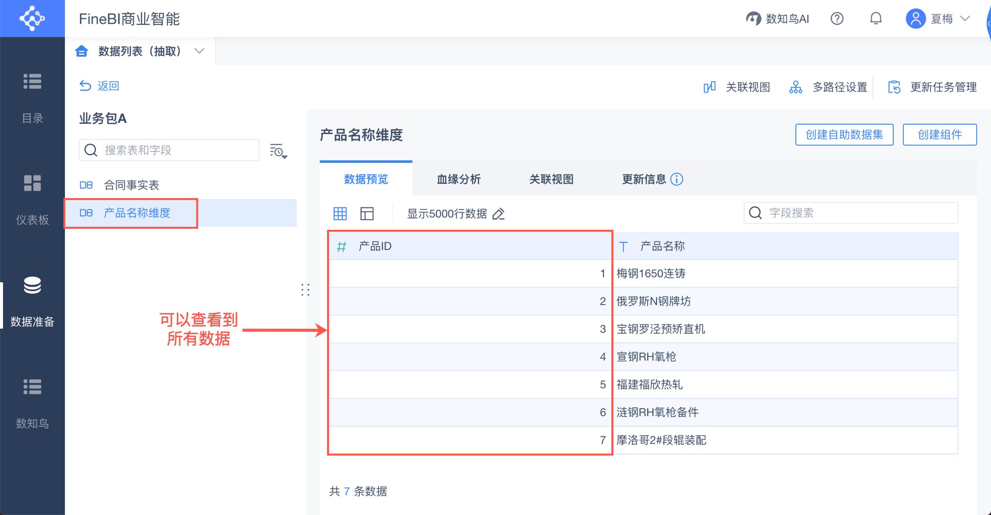 1)普通用户 Alice 登录FineBI系统查看,「合同事实表」的主表「产品名称维度表」可以看到所有的数据,不会受到行权限的影响,如下图所示: