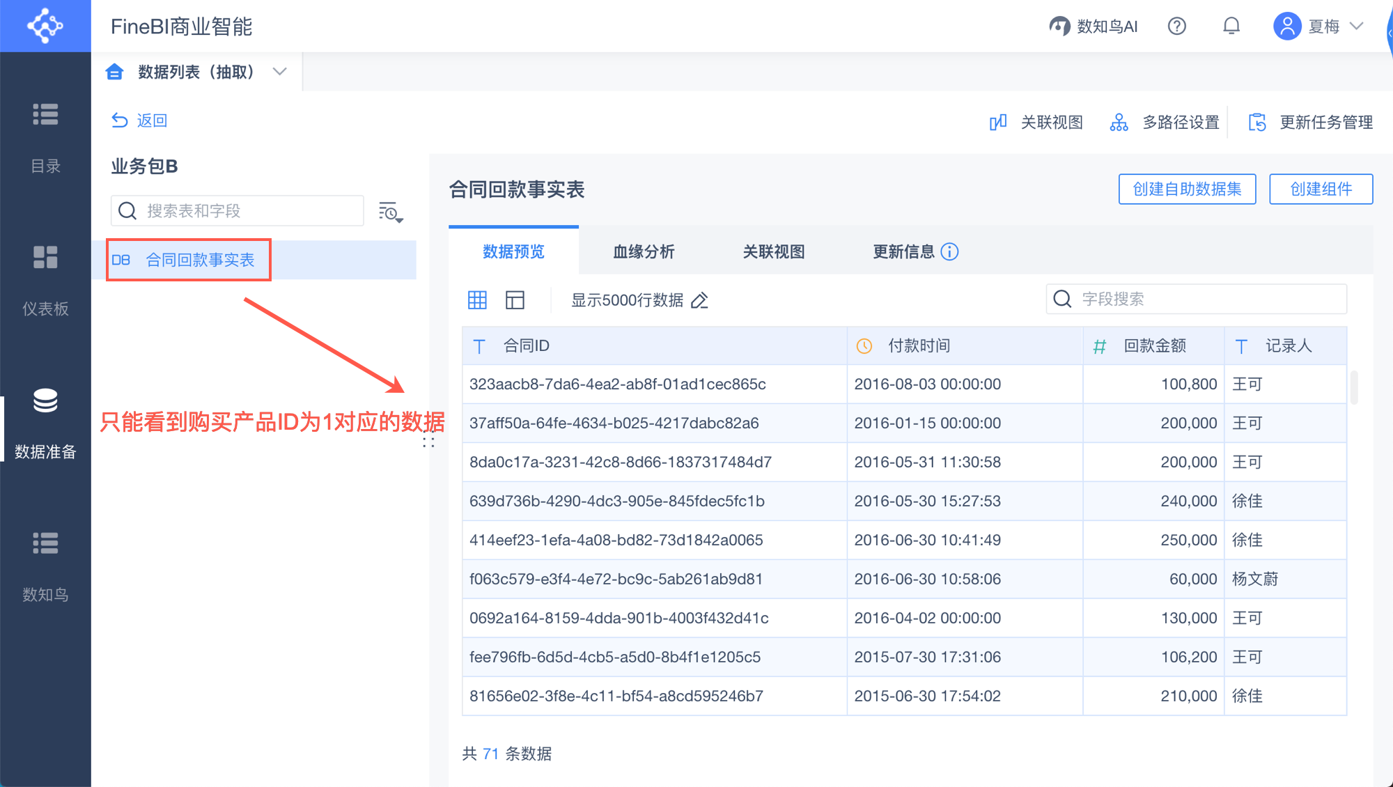 2)「合同事实表」以及作为「合同事实表」的子表「合同回款事实表」只能看到购买的产品等于 1 的数据,受到了主表的行权限影响,如下图所示: