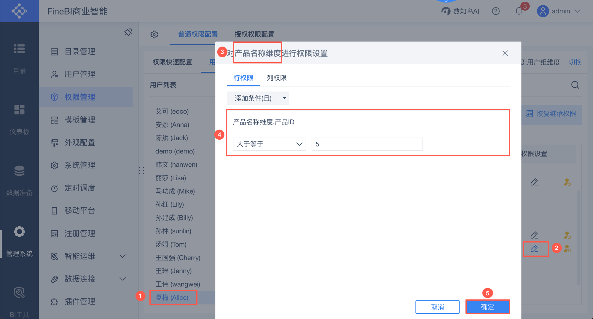 1)对「产品名称维度表」设置行权限产品 ID 大于等于 5 ,如下图所示: