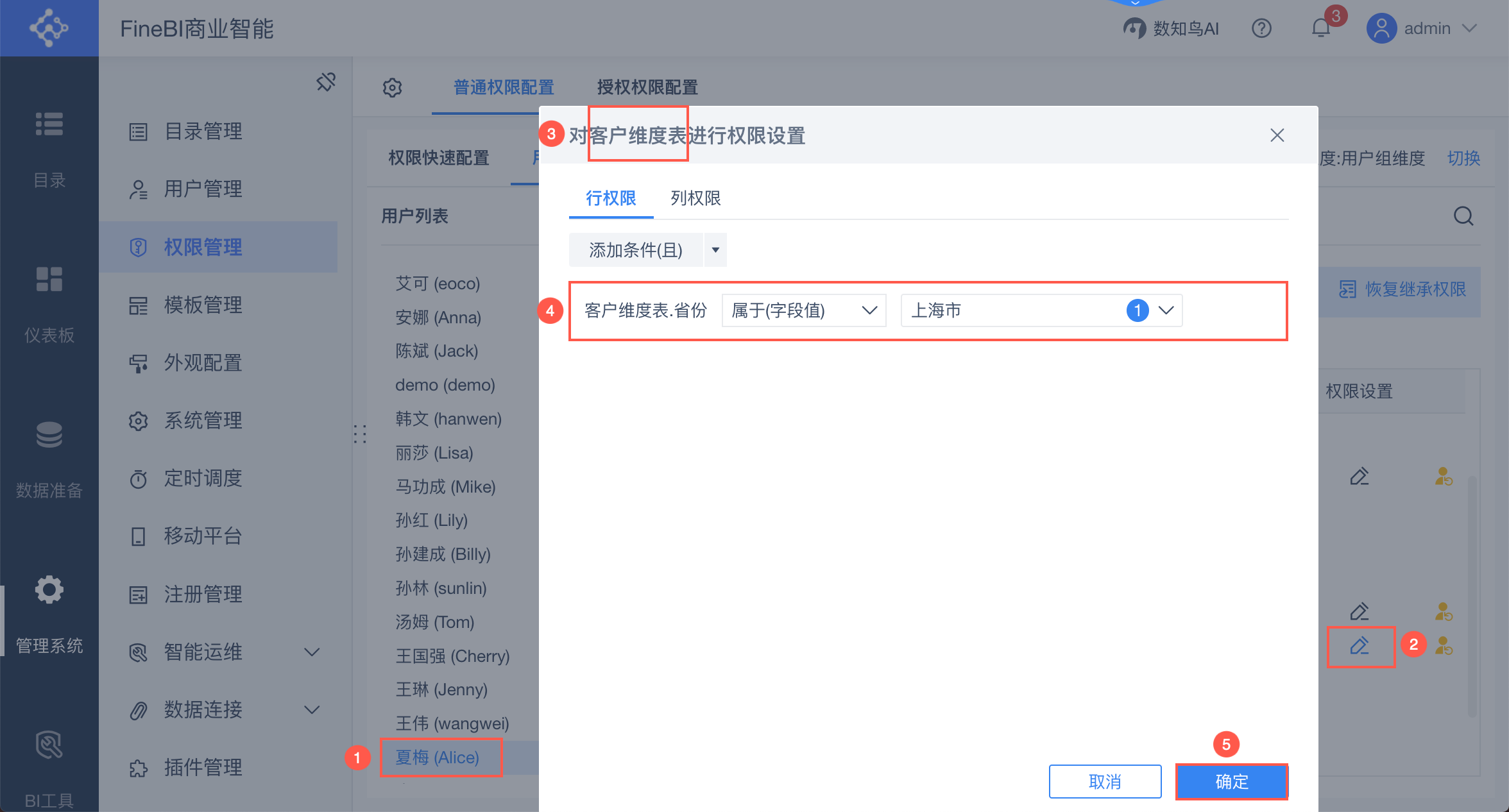 2)对「客户维度表」设置行权限,省份属于上海市,如下图所示: