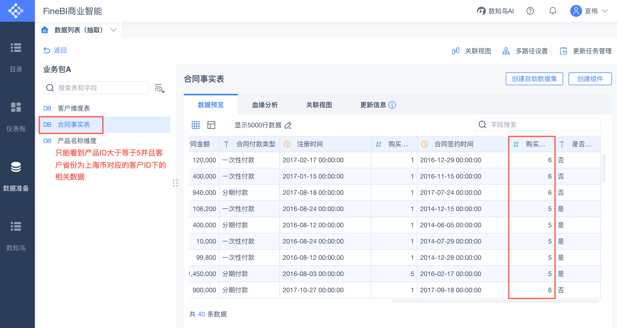 Alice 登录FineBI系统查看「合同事实表」,「合同事实表」只能看到产品 ID 大于等于 5 并且客户省份为上海市对应的客户 ID 下的相关数据。 如下图所示: