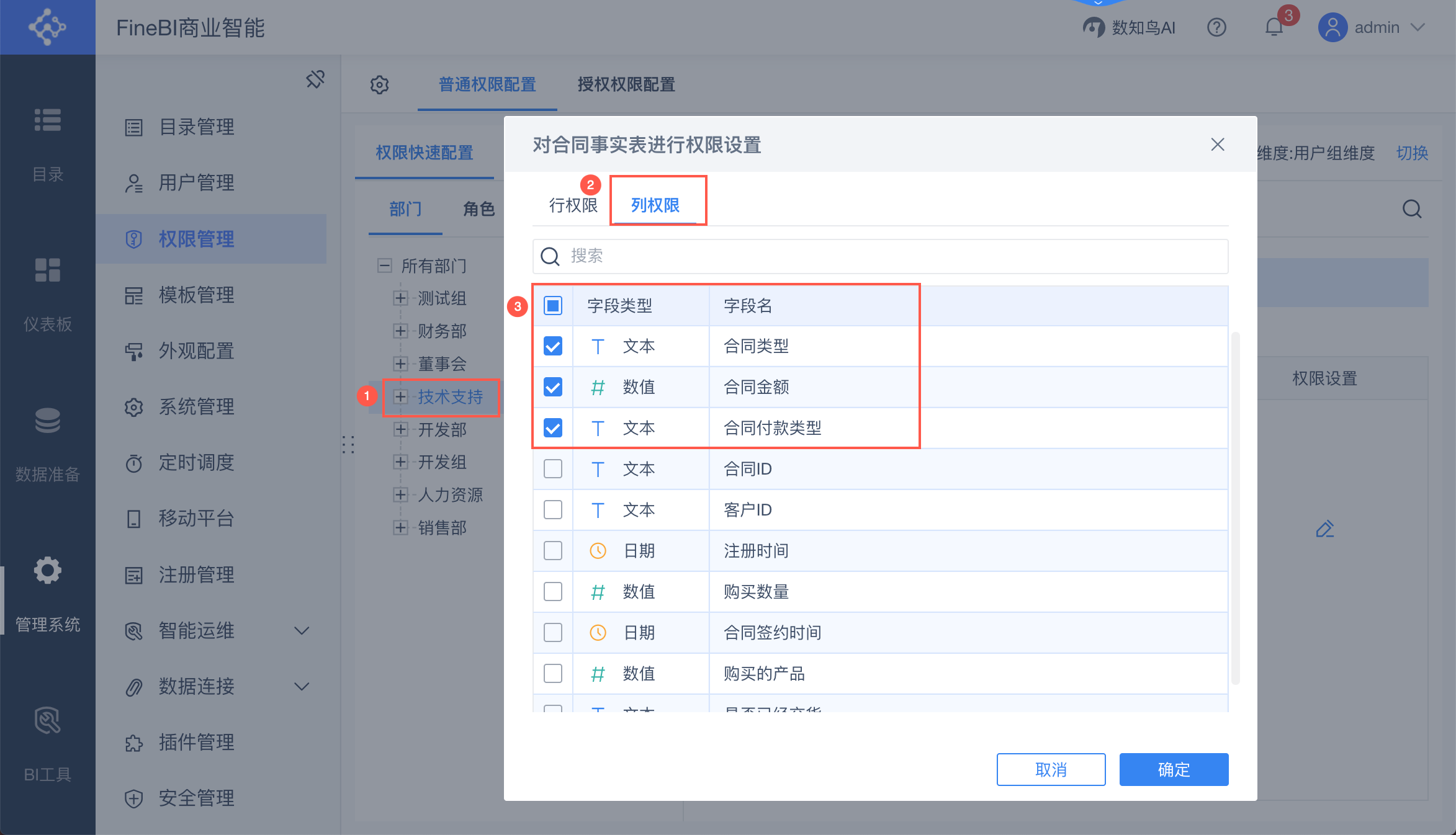 1)对技术支持部门设置业务包 A 中「合同事实表」的列权限,选择字段合同金额、合同付款类型、合同类型,如下图所示:
