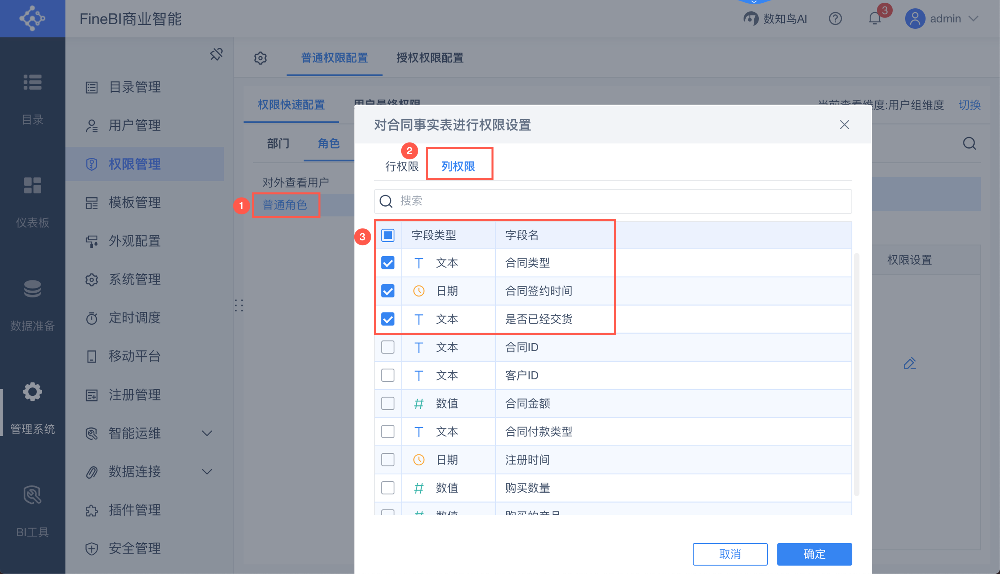 2)对普通角色设置业务包 A 中「合同事实表」的列权限,选择字段合同类型、是否已经交货、合同签约时间,如下图所示: