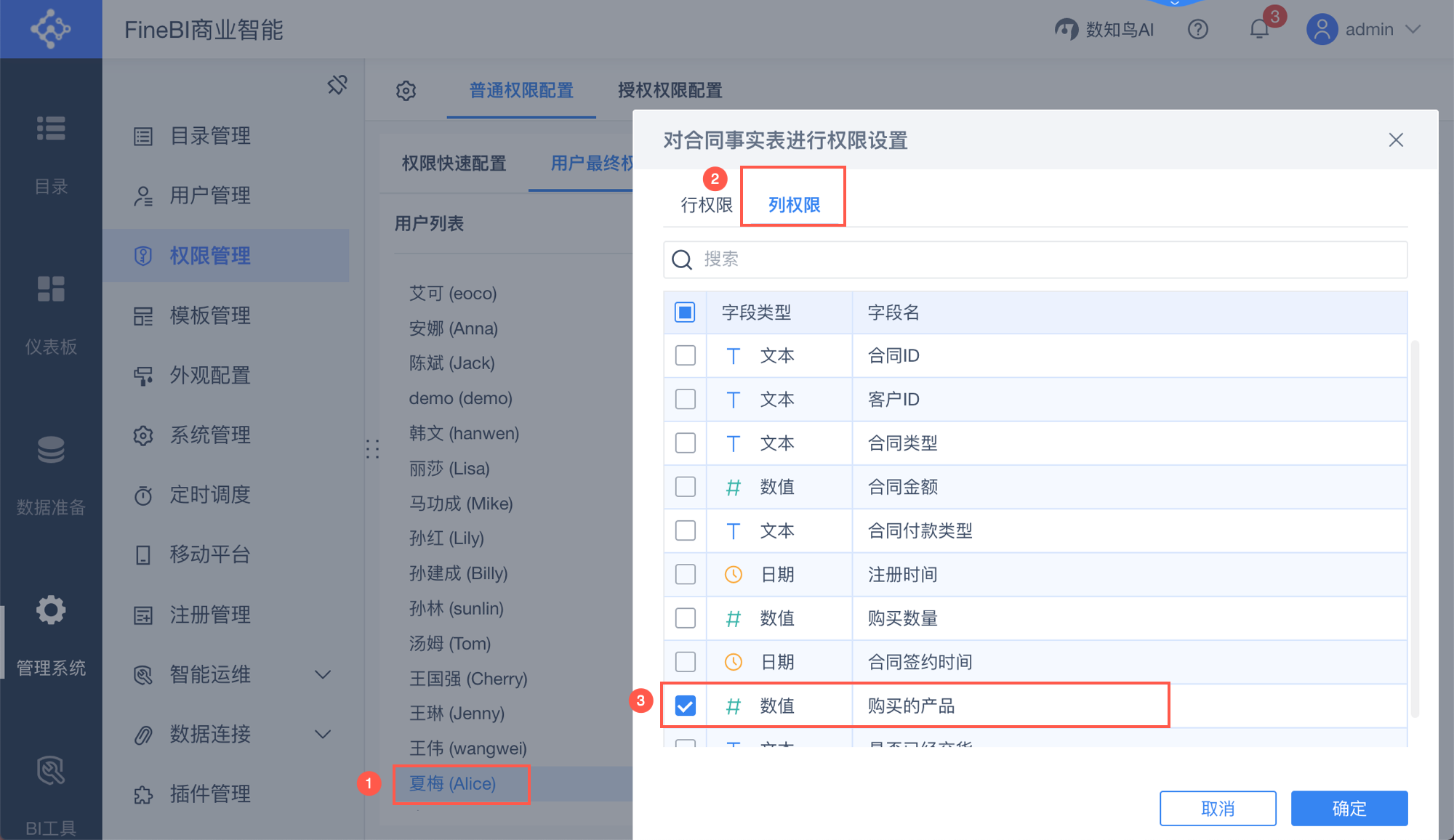 用户 Alice登录FineBI系统查看 「合同事实表」的界面,只显示「购买的产品」字段,则该用户的列权限完全取决于对该用户的设置,对部门角色的设置不再影响该用户,如下图所示: