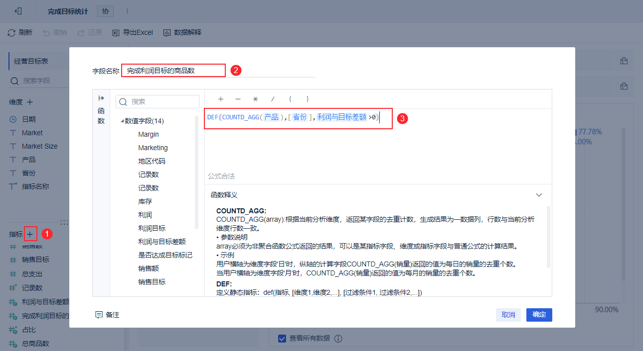 | DEF(COUNTD_AGG(产品),[省份],利润与目标差额>0) | 对[省份]分组,对【满足达成利润目标即利润与目标差额大于0 的】产品去重计数,可求出每个省份有多少种产品完成了利润目标 | DEF_定义静态指标 |