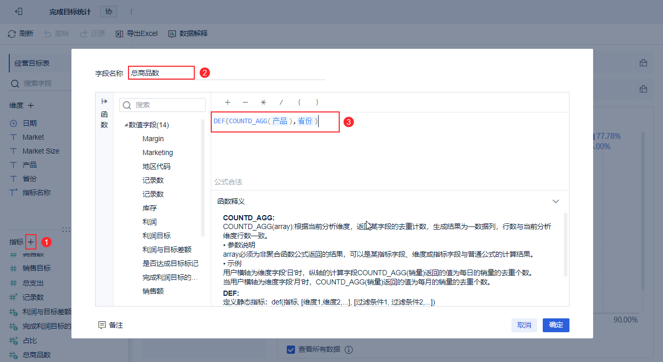 | COUNTD_AGG(产品) | 对产品进行去重计数,计算出有多少种产品 | COUNTD_AGG |