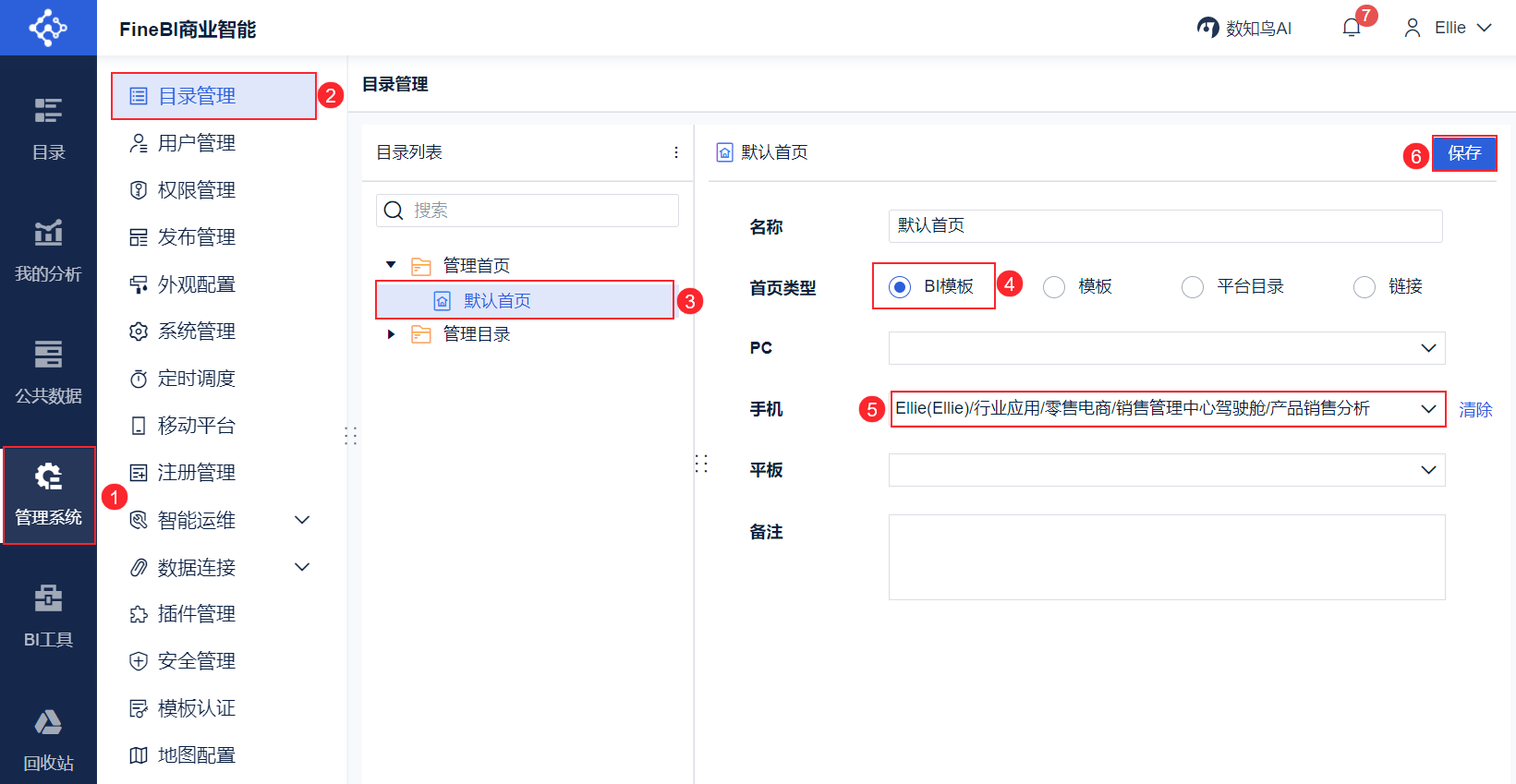 注1:手机端支持设置四种首页类型:BI 仪表板、模板、平台目录和链接,详细的设置步骤请参见:管理首页