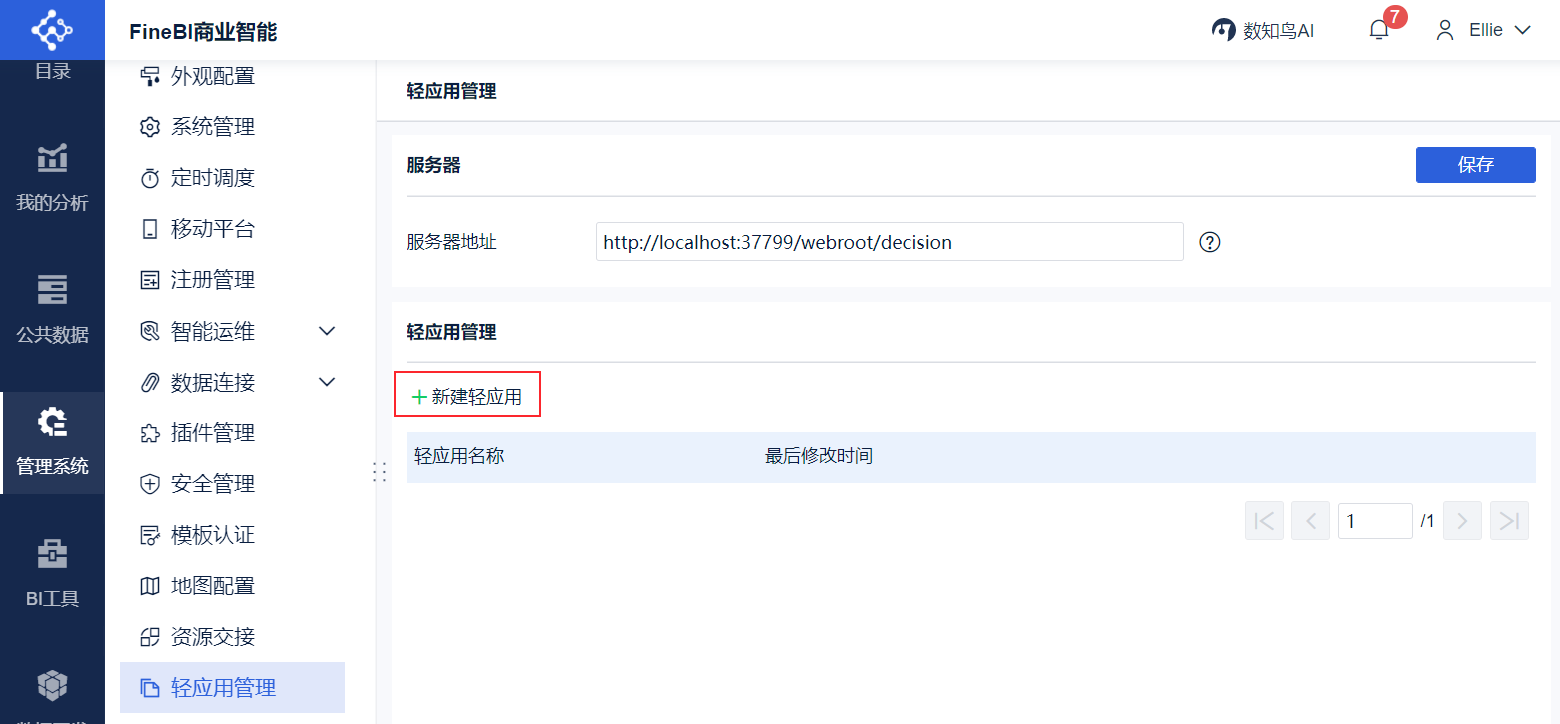 2)进入「管理系统>轻应用管理」,填写服务器地址后「保存」。如下图所示: