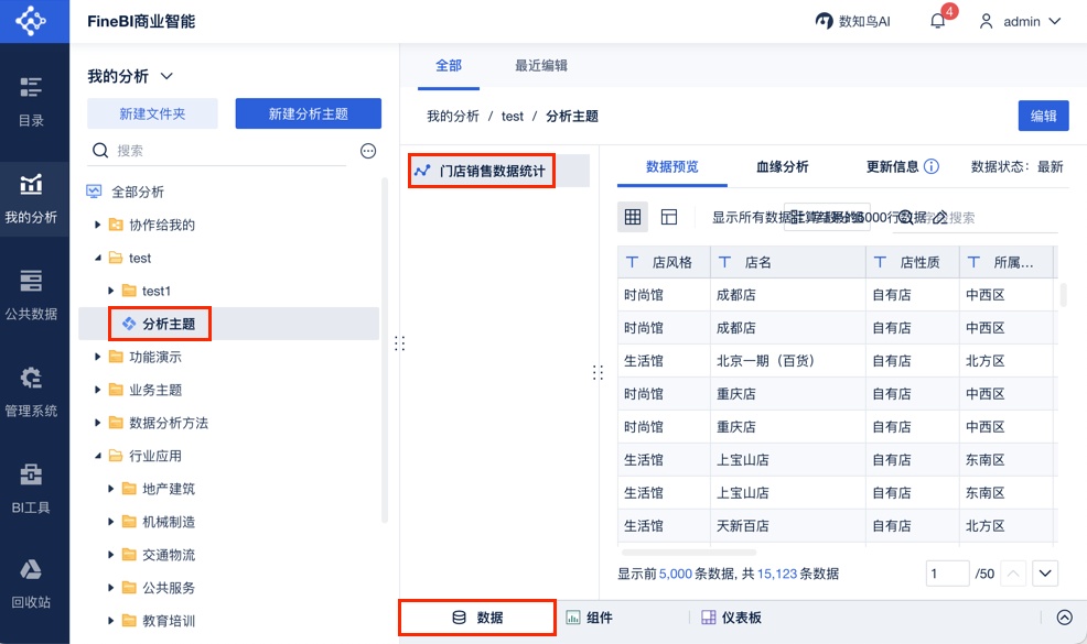 新建分析主题,将「门店销售数据统计」添加至分析主题中,如下图所示: