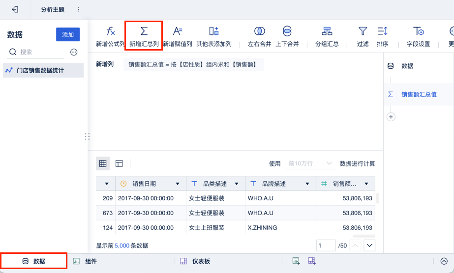 1)进入数据编辑界面,新增汇总列。如下图所示: