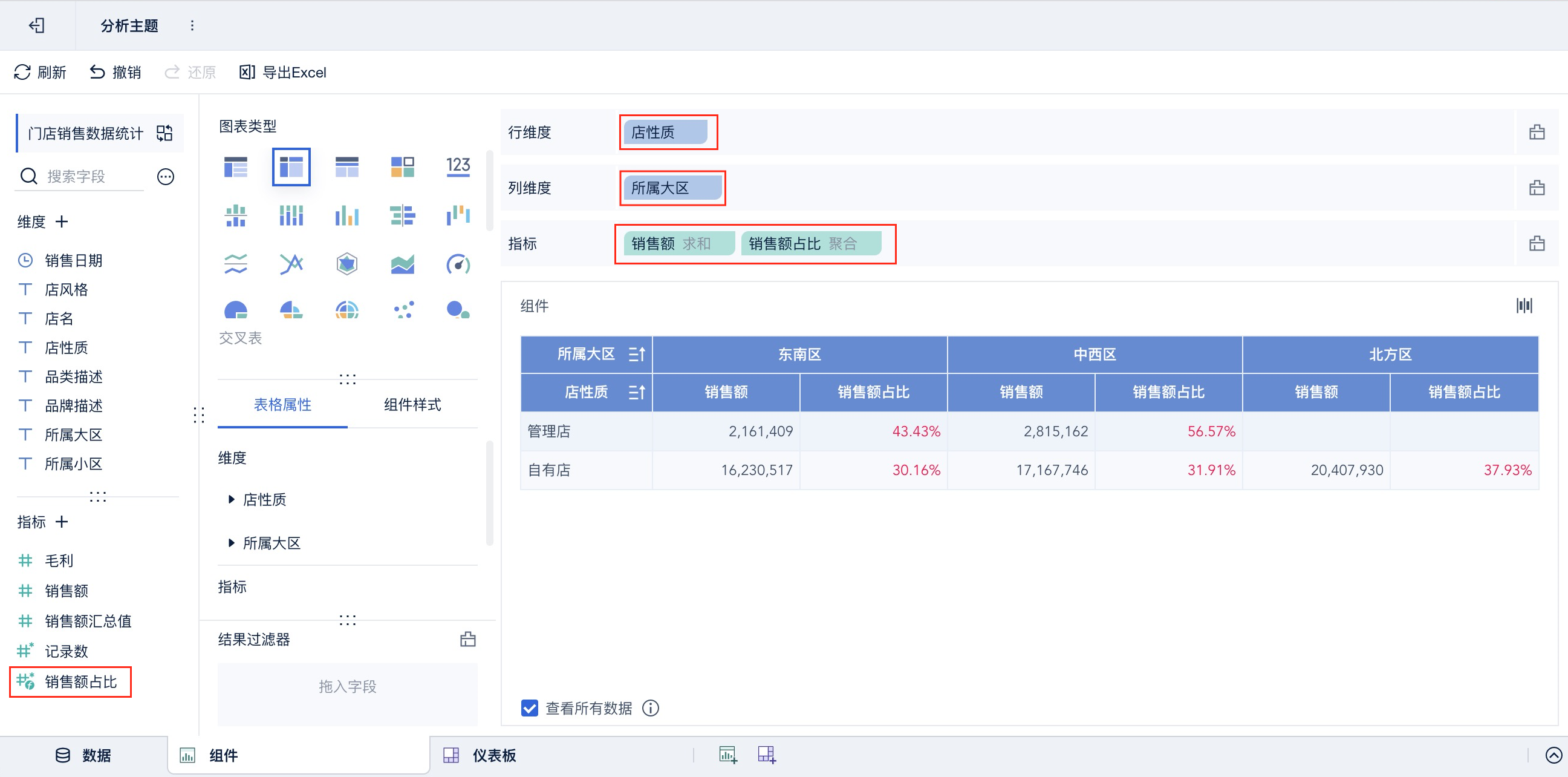 注:行维度只有「店性质」,因此2.2.2章节的「分组字段」也只需按「店性质」分组即可;
