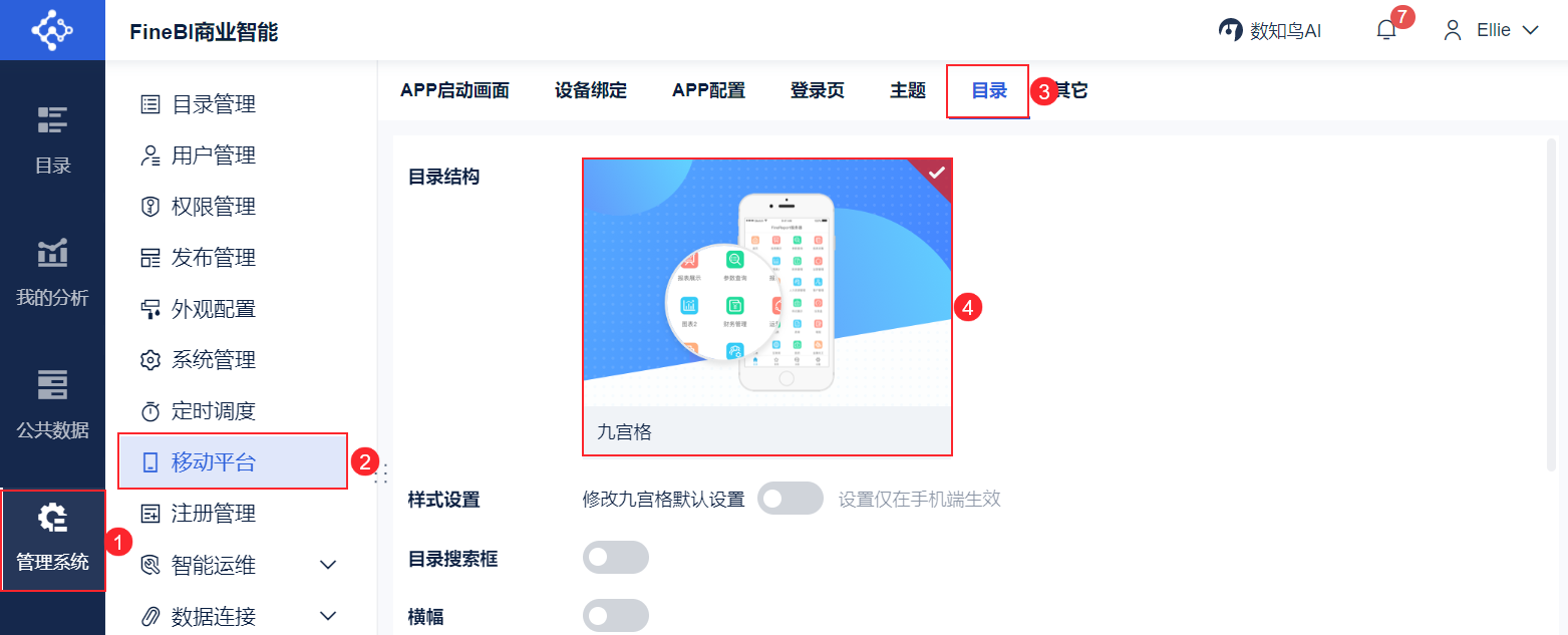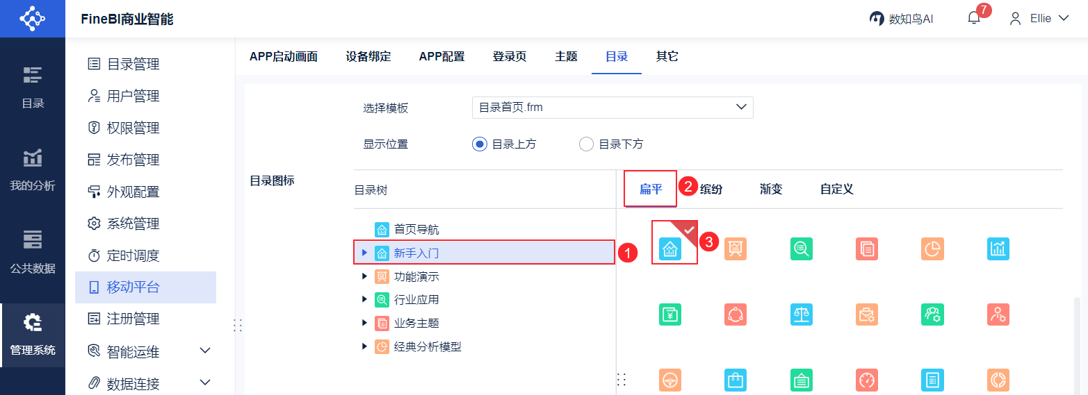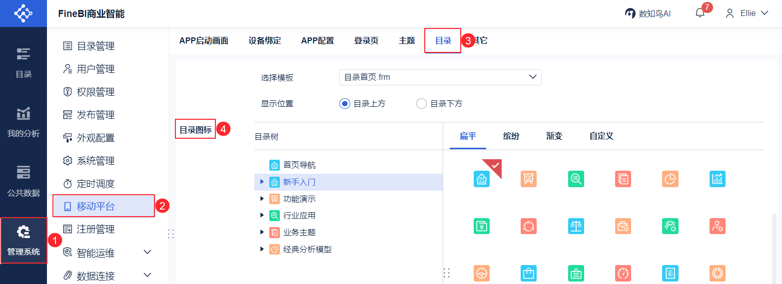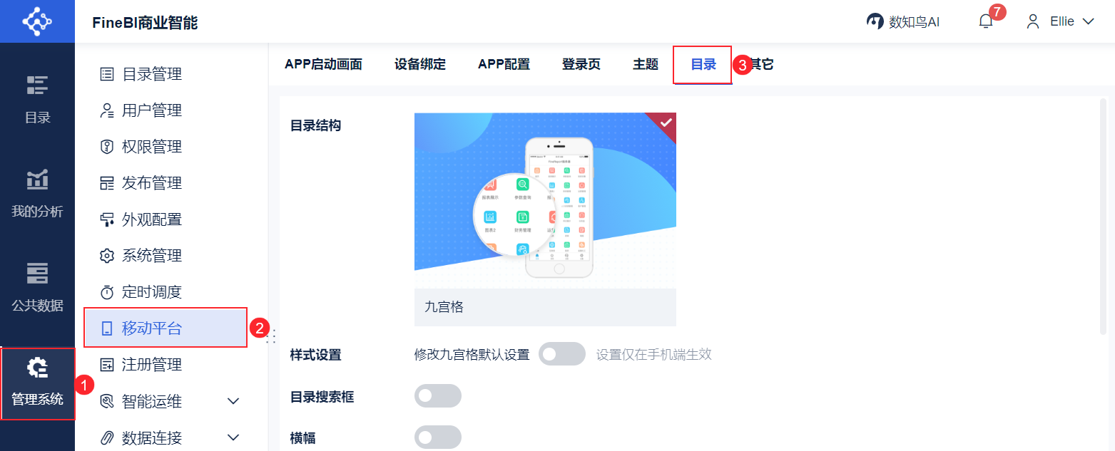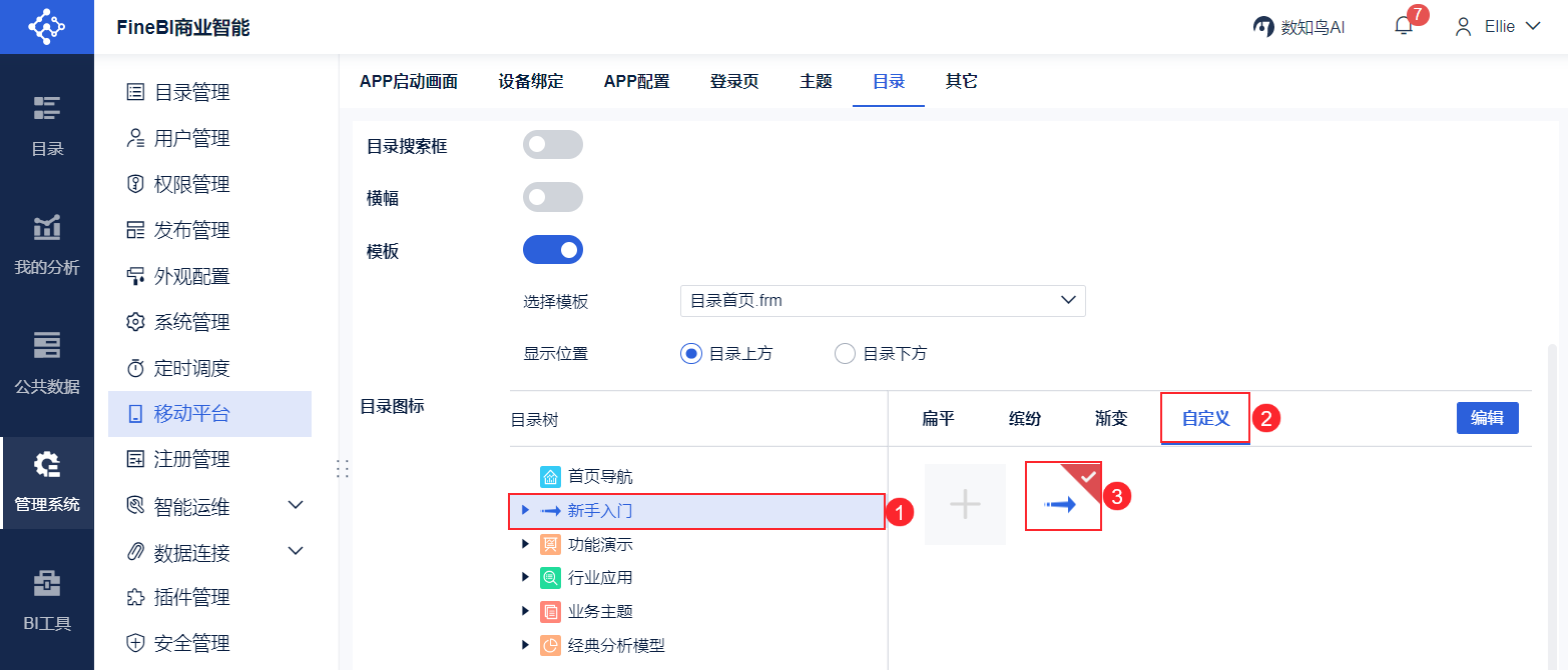 管理员进入数据决策系统,选择「管理系统>移动平台>目录」,可对移动端目录结构进行设置。如下图所示: