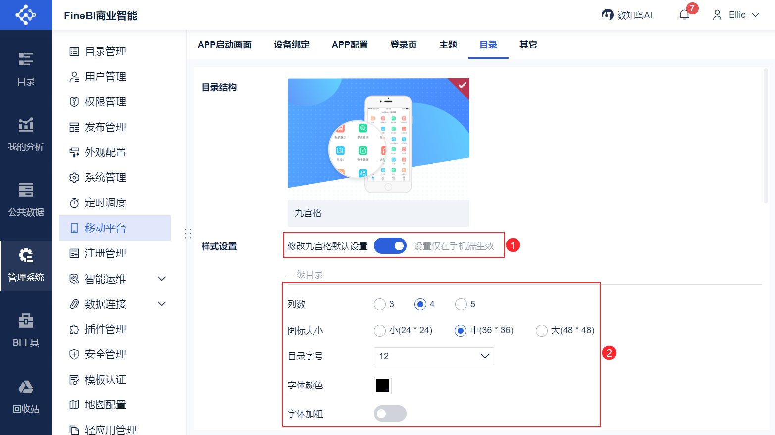目录结构为九宫格时,可对移动端「一级目录」样式进行设置。