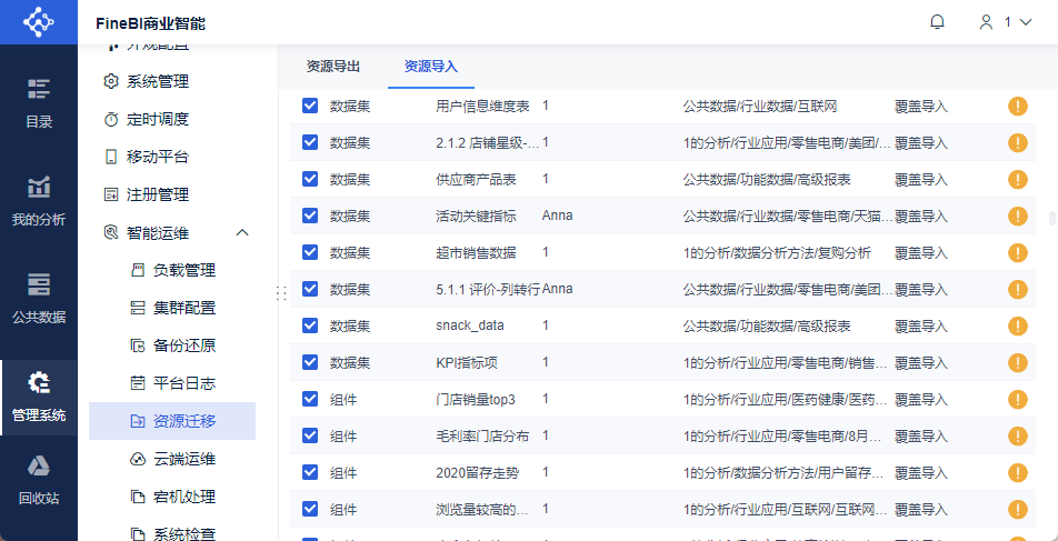 管理员登录FineBI系统,点击「管理系统>智能运维>资源迁移」,分为「资源导出」、「资源导入」两部分,如下图所示: