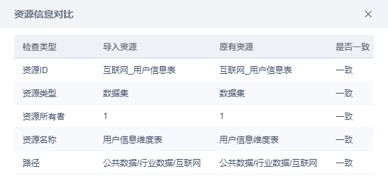 系统会获取导入文件所包含的资源,包含资源类型、资源名称、资源所有者、资源路径、导入方式和资源信息对比。