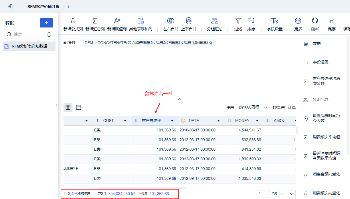 点击数值字段,显示该列「求和」、「平均」数值