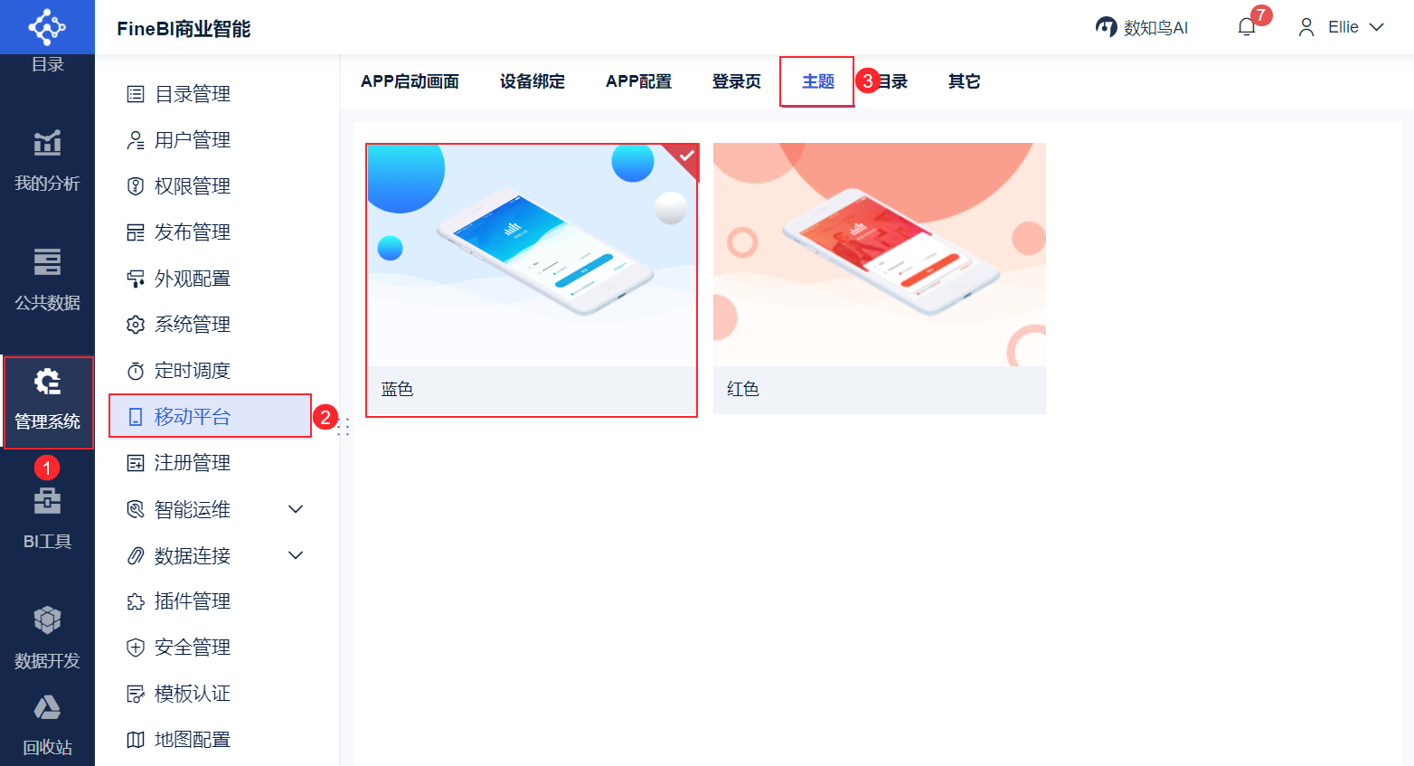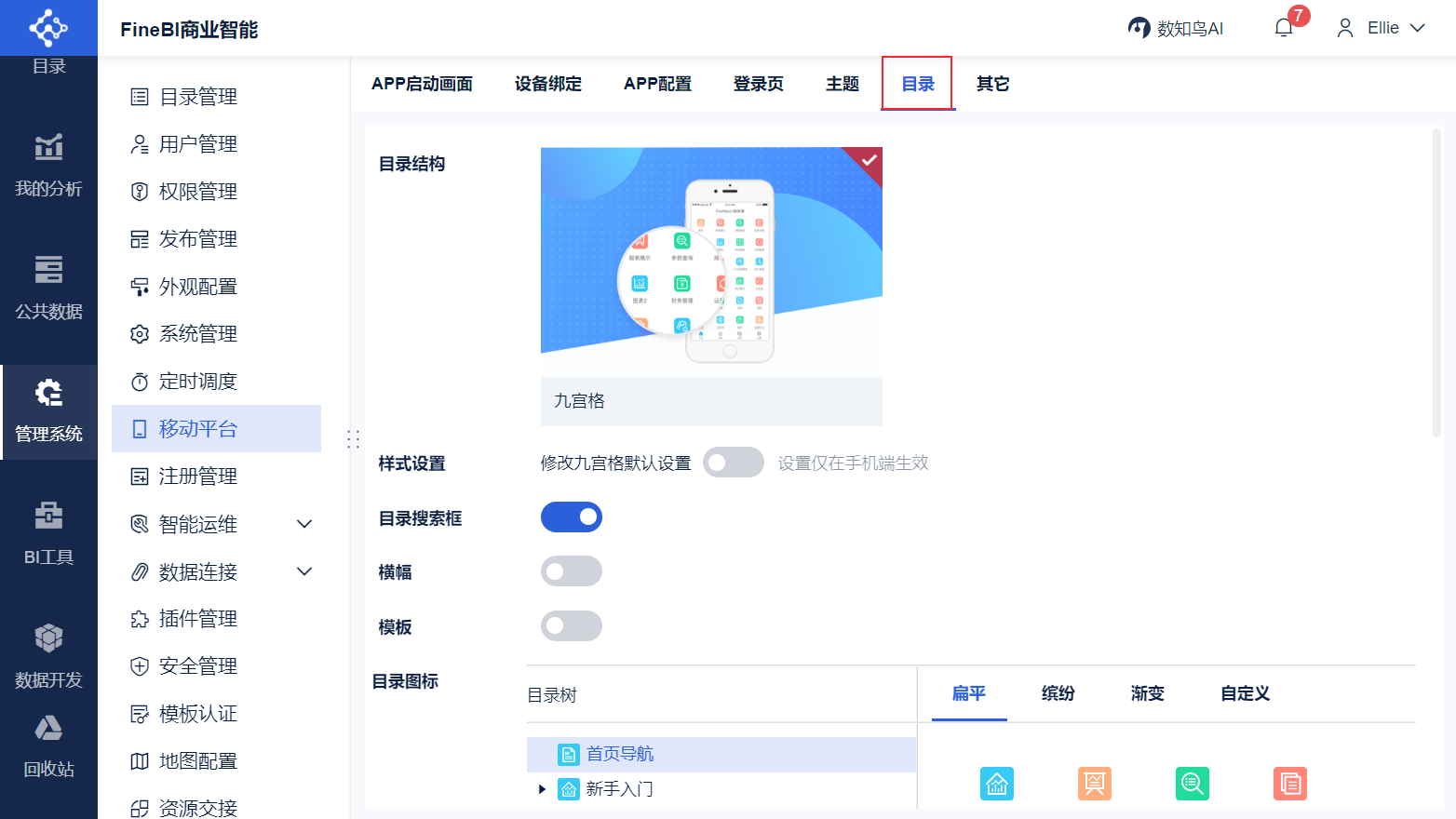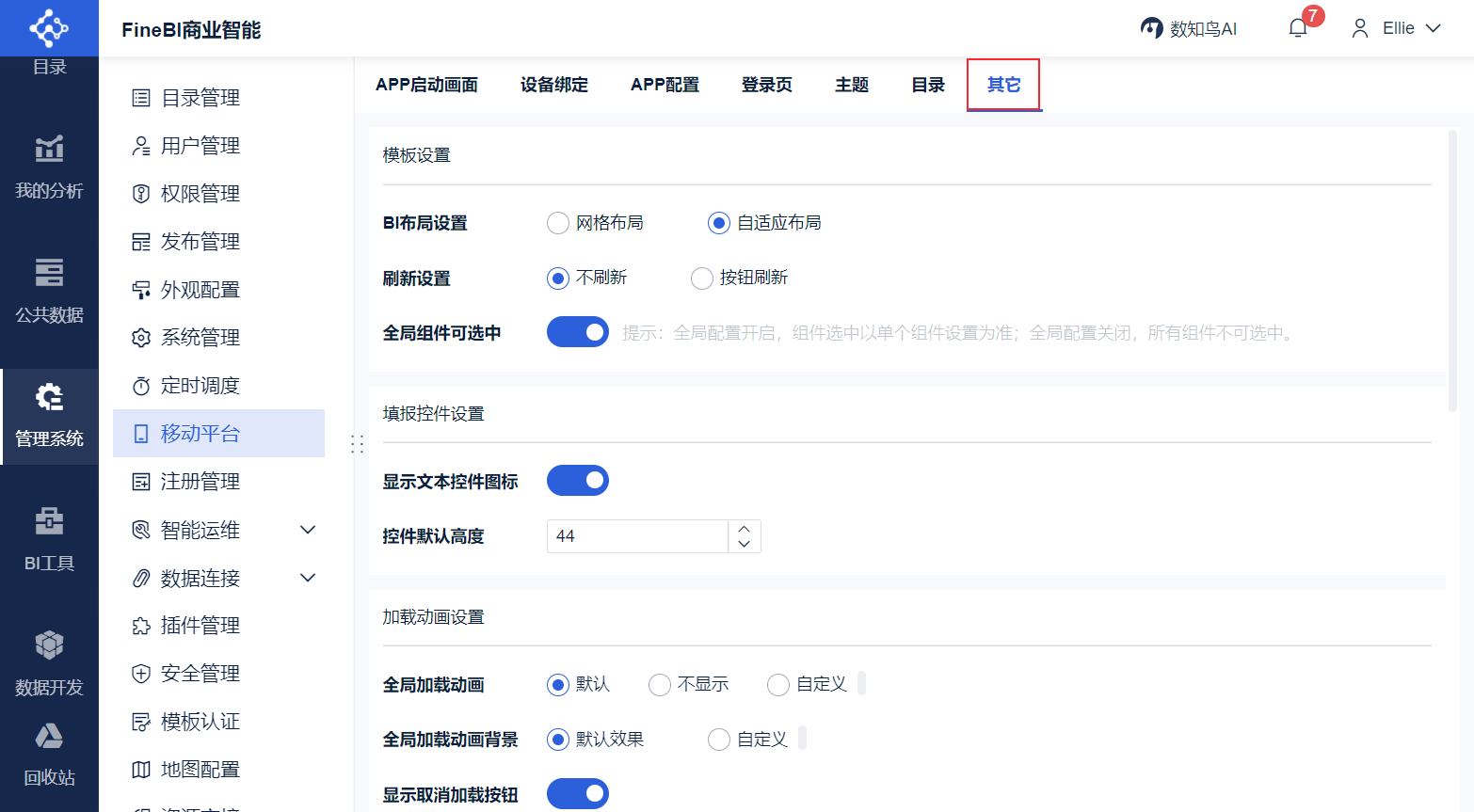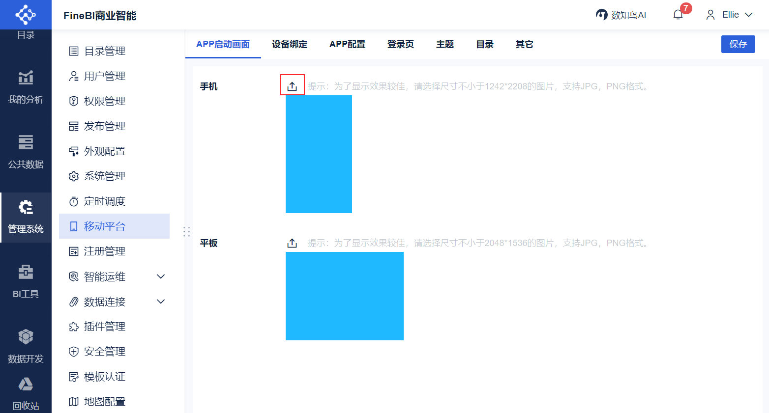 用户以管理员身份登录 BI,点击「管理系统>移动平台」,可看到 7 个 Tab 页,分别为:App 启动画面、设备绑定、APP配置、登录页、主题、目录、其他。