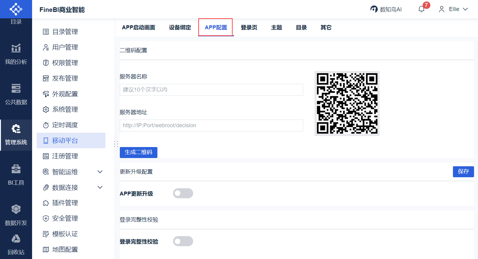 APP配置 可以设置 BI 与 App 之间的关联,进行二维码配置、更新升级配置和登录完整性校验。