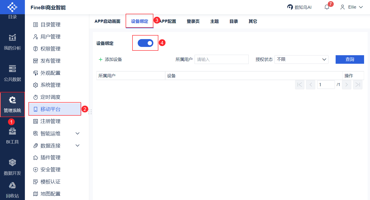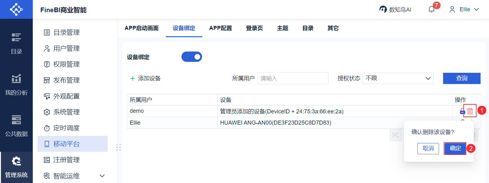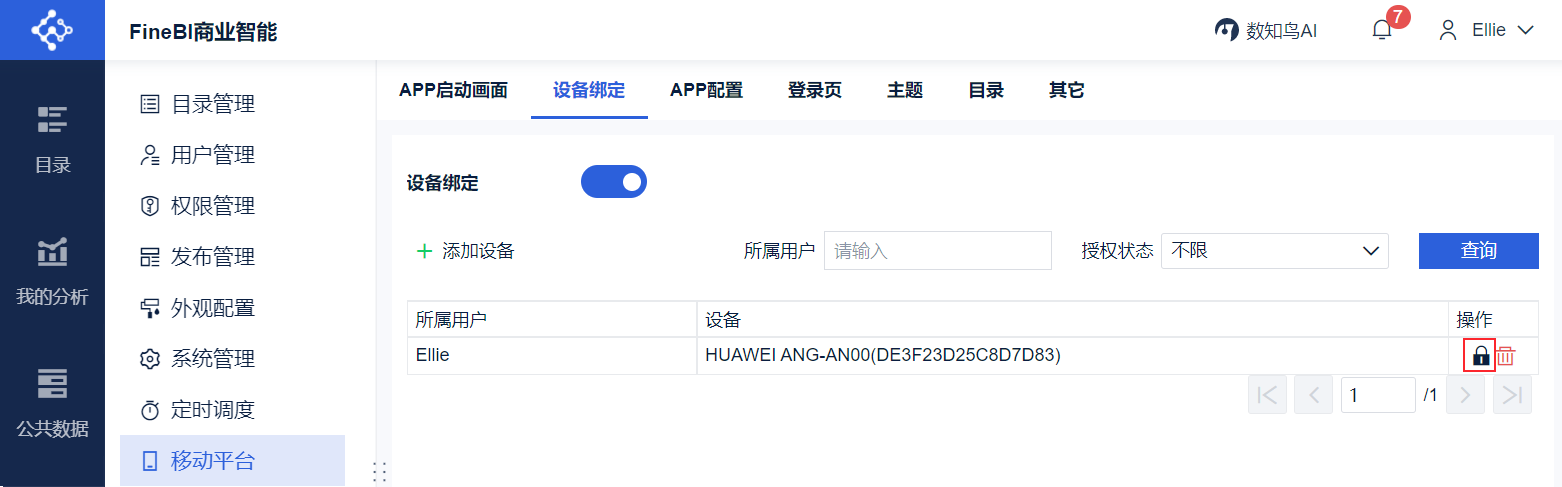 为了增强移动端的登录验证机制,保证数据的安全性,FineBI 提供了「设备绑定」的功能,将用户的移动设备与系统绑定起来。