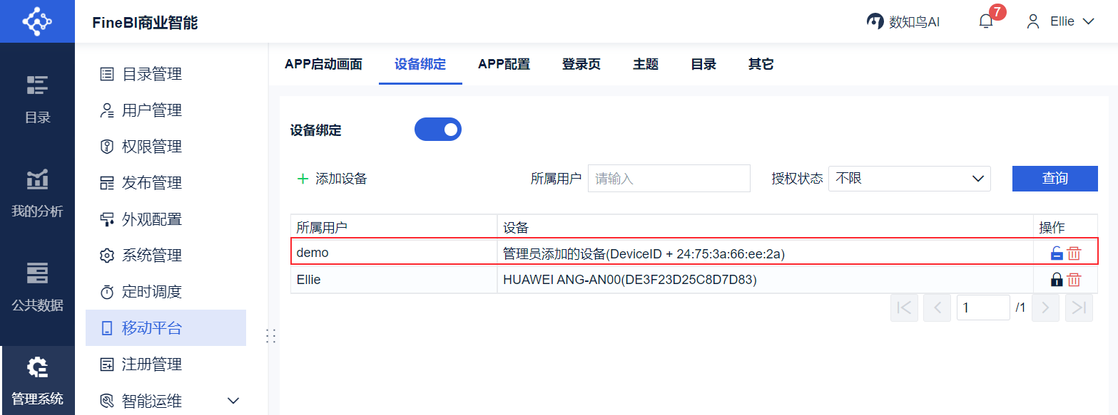 2)登录后,以管理员身份进入数据决策系统,点击「管理系统>移动平台>设备绑定」,设备列表中自动新增刚刚绑定的用户名和设备绑定码,设备已自动授权。