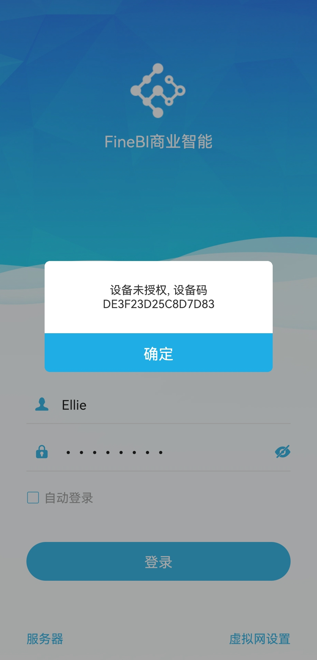 1)开启设备绑定后,一个从未授权过任何设备的用户,第一次使用移动设备登录 App 访问 BI 工程/仪表板,服务器即可自动绑定移动设备。