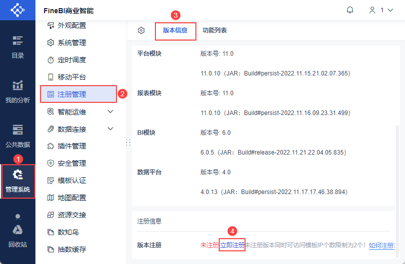 管理员登录FineBI系统,点击「管理系统>注册管理>立即注册」,如下图所示: