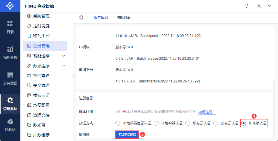 此时,用户可选择加密锁注册,无需提供服务器的 MAC 地址,通过绑定 FineBI 工程名称即可实现授权。