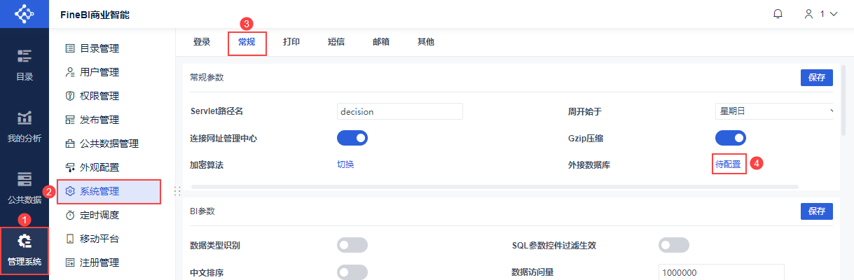 2)对于使用内置数据库的系统,管理员登录数据决策系统,点击「管理系统>系统管理>常规>外接数据库>待配置」,可为系统第一次配置外接数据库。如下图所示: