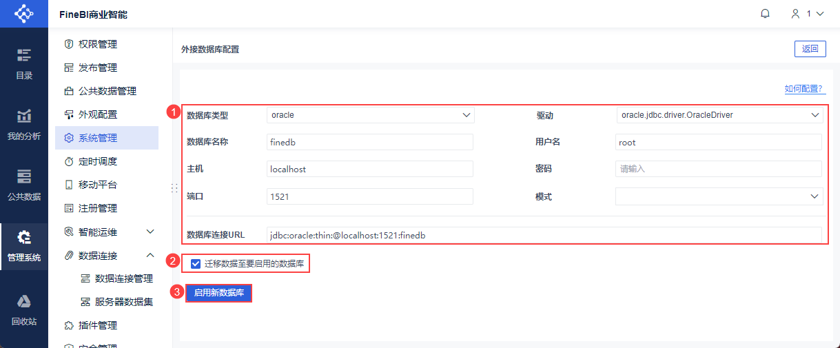 3)对于已启用外接数据库的系统,管理员登录数据决策系统,点击「管理系统>系统管理>常规>外接数据库>已配置」,可为系统迁移至新的外接数据库。如下图所示: