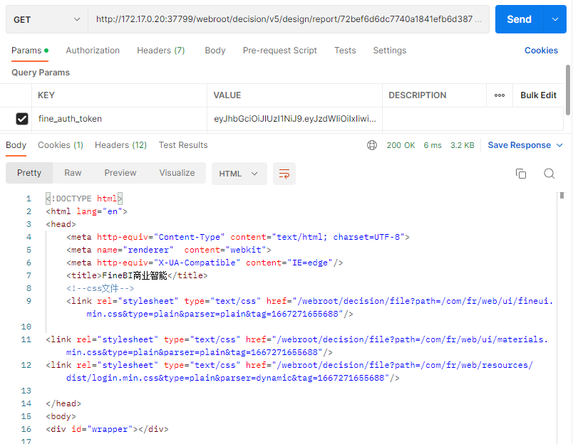 | 请求示例 | http://172.17.0.25:37799/webroot/decision/v5/design/report/bee9214a49eb4da2b2b8a92f60424685/view?fine_auth_token=xxx 注:使用接口时需要登录,需要传递token参数。 |