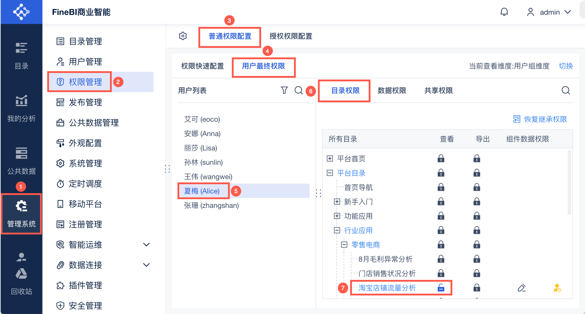 本示例选择用户 Alice。选择「目录权限」Tab,为用户 Alice 分配目录「淘宝店铺流量分析」的查看权限,如下图所示: