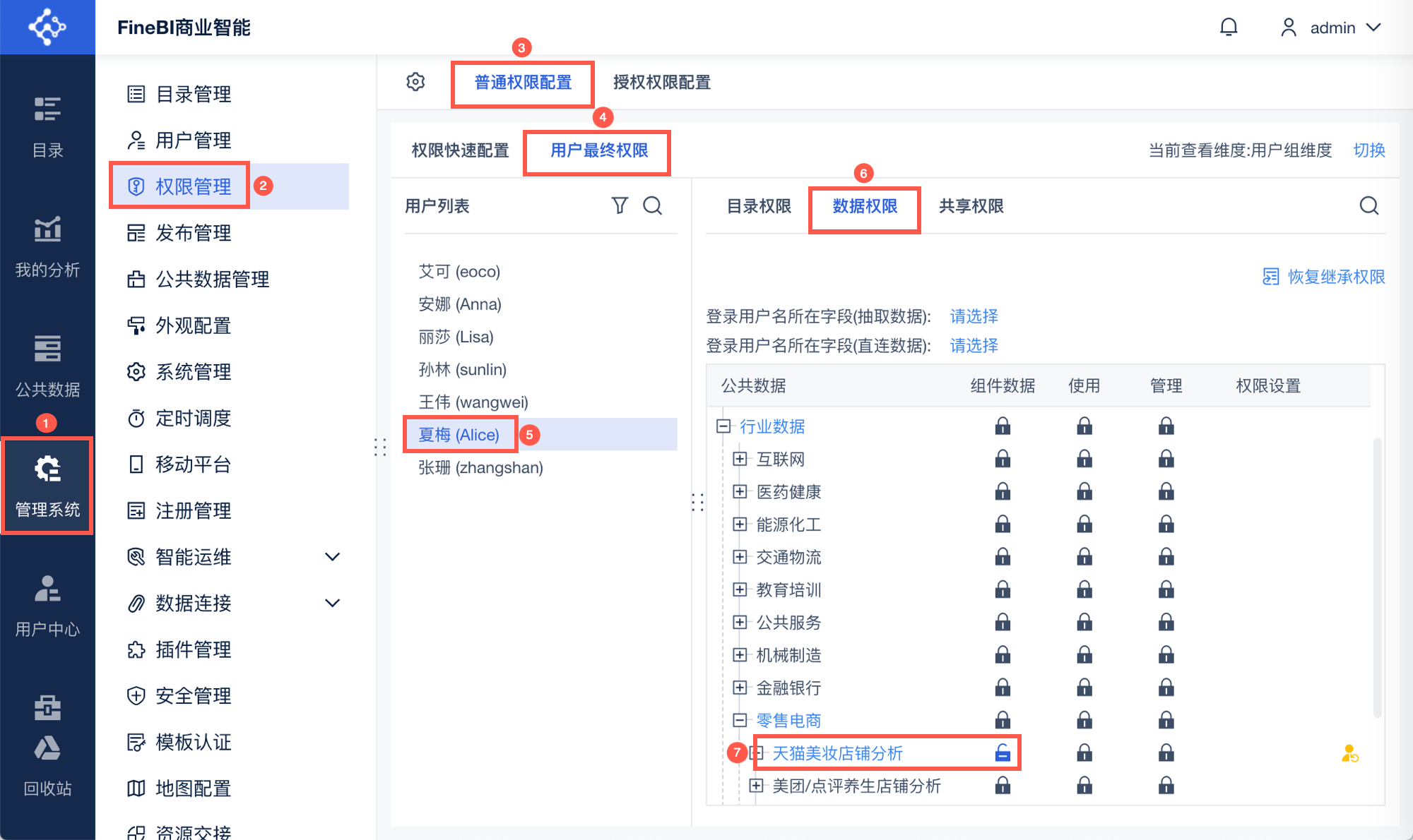 「淘宝店铺流量分析」仪表板,使用了「公共数据>行业数据>零售电商>天猫美妆店铺分析」文件夹中的数据。因此需要给用户 Alice 分配该文件夹的组件数据权限。