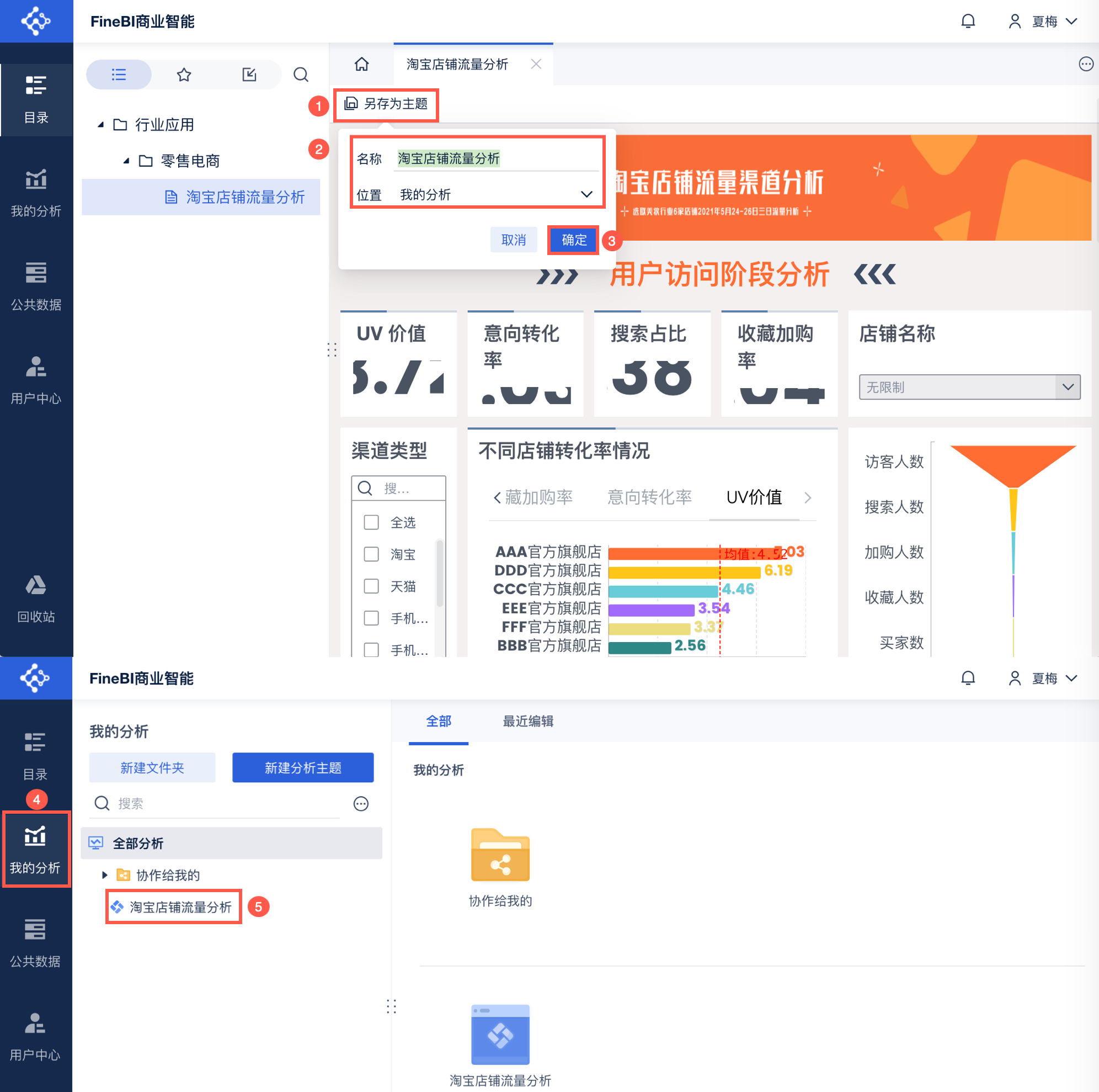 本章示例:用户 Alice 将目录中挂出的「淘宝店铺流量分析」仪表板另存为主题。