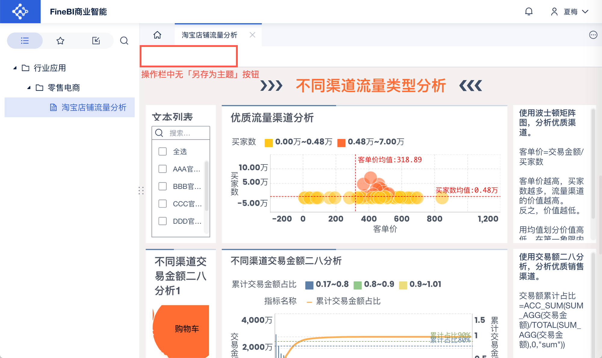 目录中已挂出的看板,用户可以将其另存为主题来进行自己的业务分析。