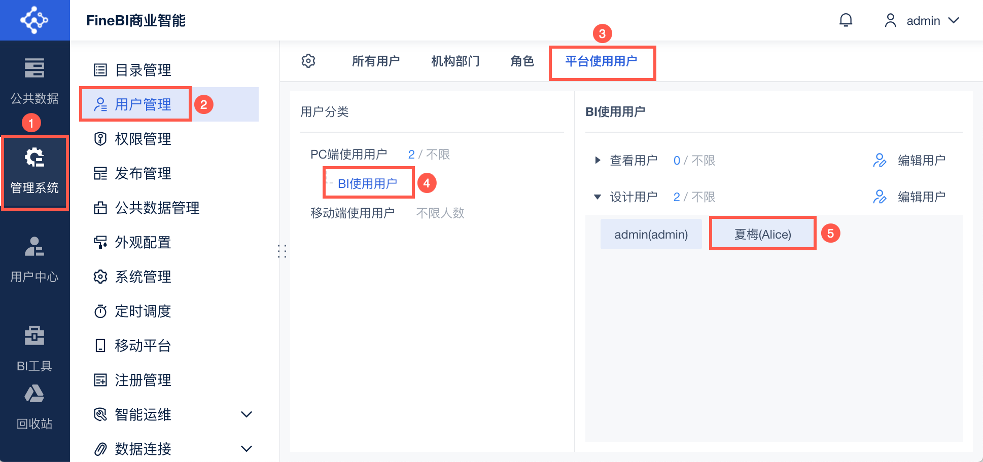 管理员登录 FineBI 系统,点击「管理系统>用户管理>平台使用用户」,将用户 Alice 添加至「BI使用用户>设计用户」中,如下图所示: