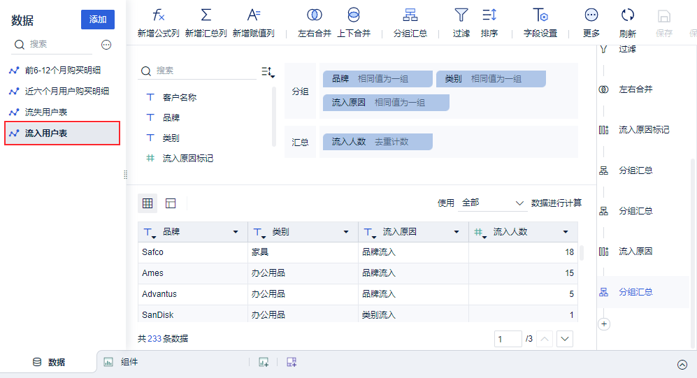 使用「流入流出汇总表」制作组件。如下图所示,制作分组表展示各种类别下每个品牌的流失人数、流入人数、净流入。