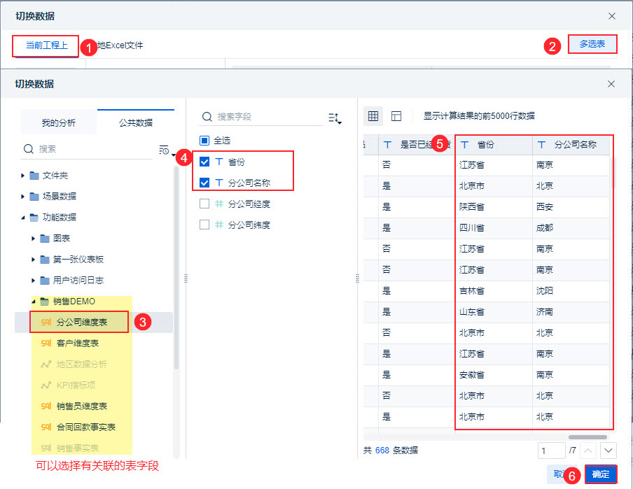 点击3.1节的「切换数据」后,点击「多选表」。例如:选择「合同事实表」后,还可以继续选择与它有关联关系的「分公司维度」表中的字段。我们这里选择「省份」、「分公司名称」,在数据预览中就多了两列数据。如下图所示: