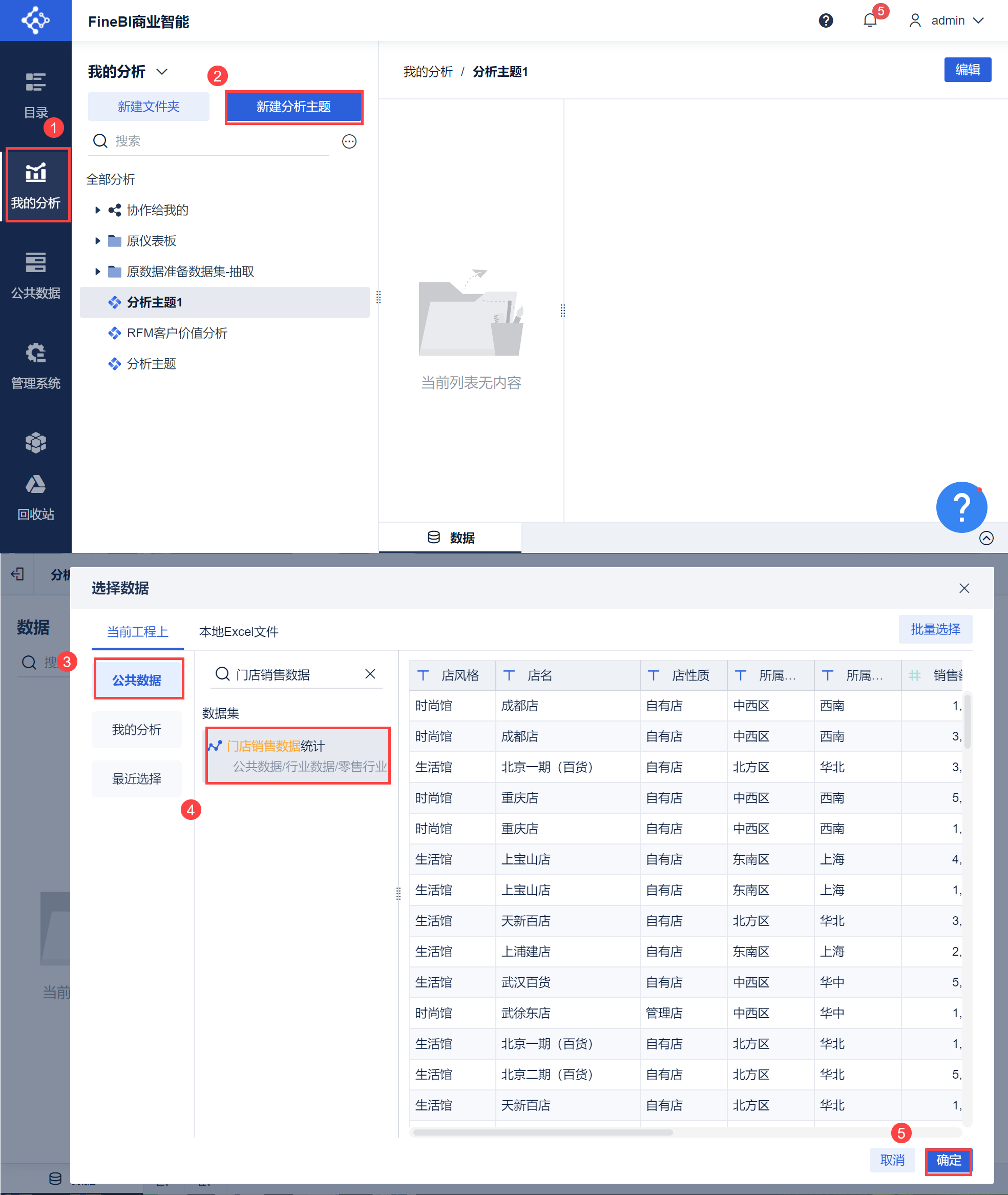 在分析主题中新建组件,进入组件编辑界面,在组件中使用门店销售数据统计,如下图所示: