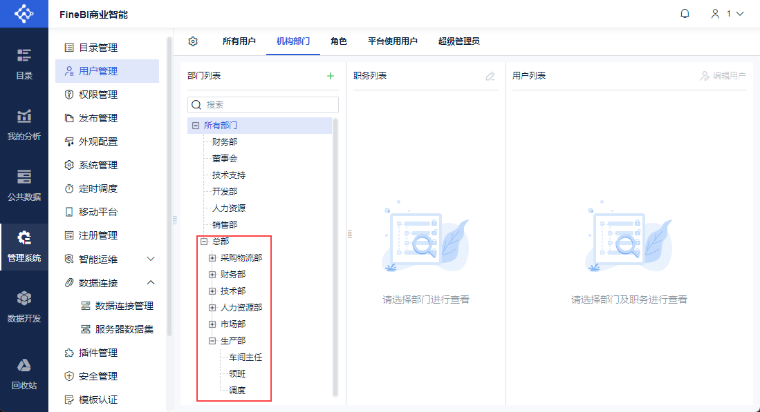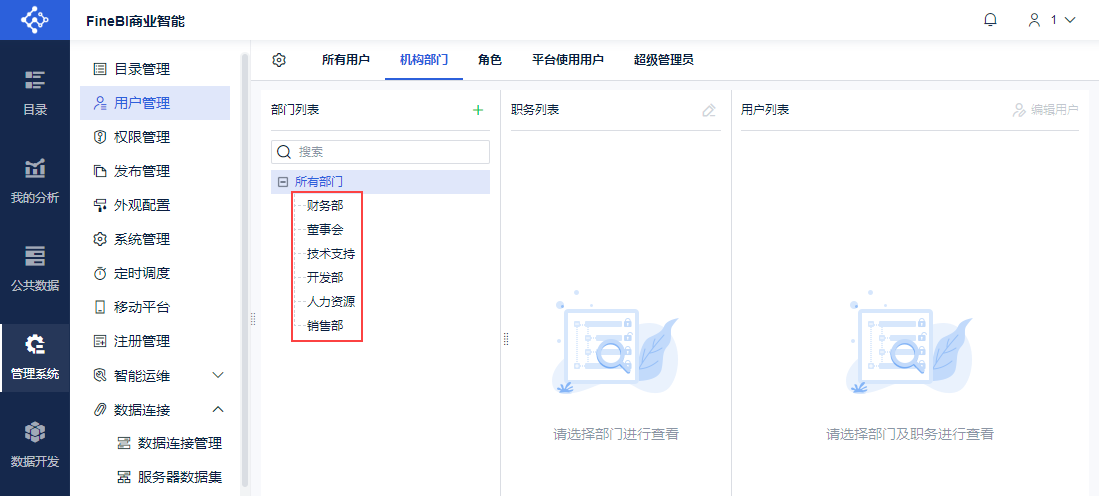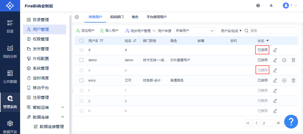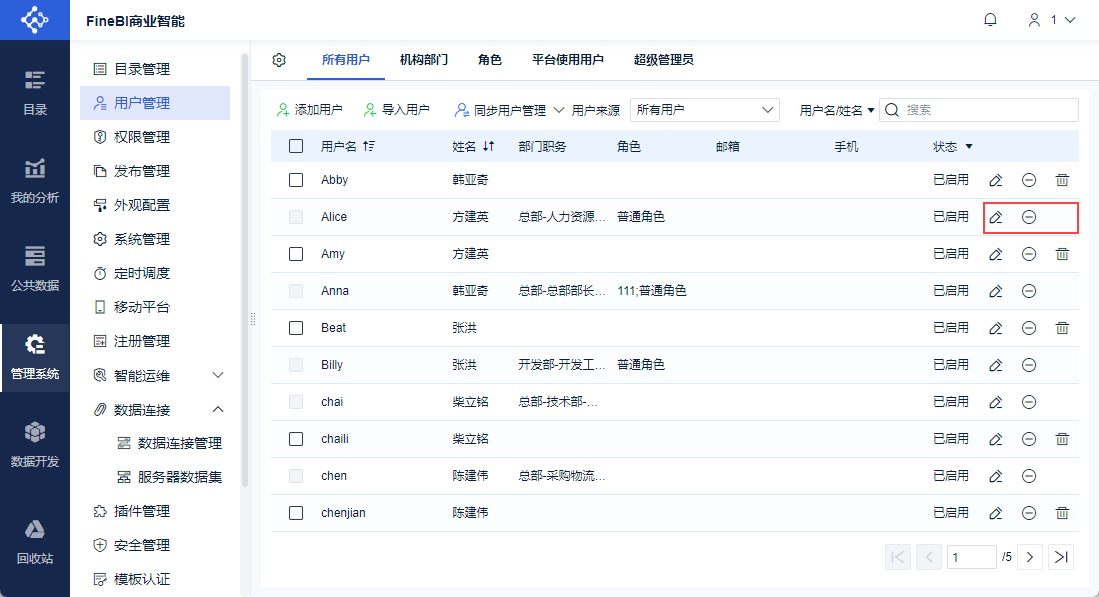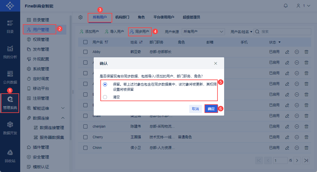 管理员登录FineBI系统,点击「管理系统>用户管理>所有用户」,点击「同步用户」。