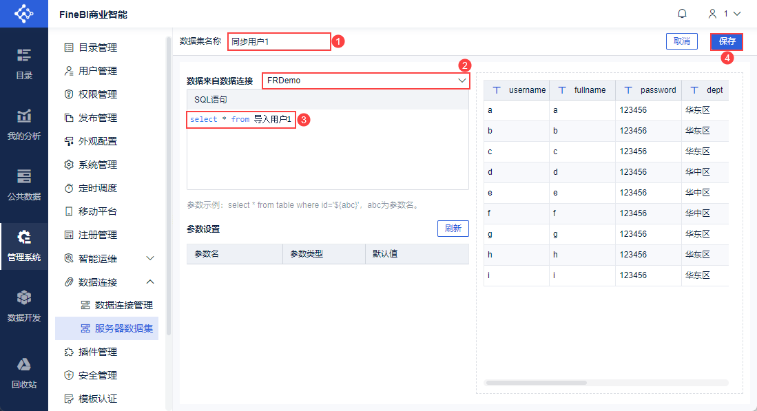 设置数据集名称为「同步用户1」,数据连接选择「FRDemo」,SQL 语句为: