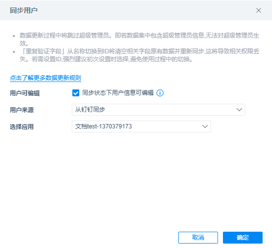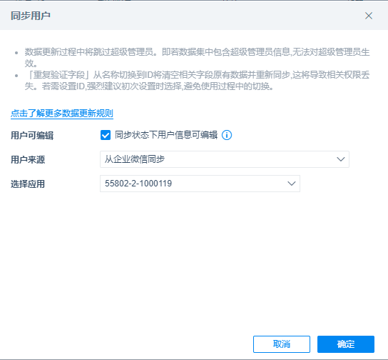 若之前同步过用户,在同步用户开启状态下执行非首次同步操作将不会出现此节提示弹窗,也不会按照此节中更新规则进行同步 。