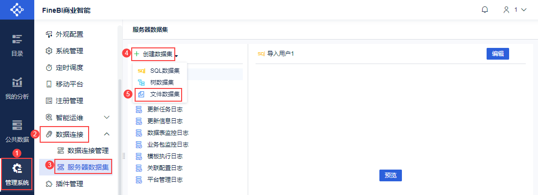 管理员登录FineBI系统,点击「管理系统>数据连接>服务器数据集」,创建「文件数据集」。如下图所示: