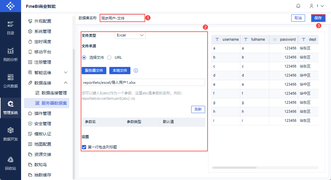 设置数据集名称为「同步用户-文件」,选择上文准备的表格。
