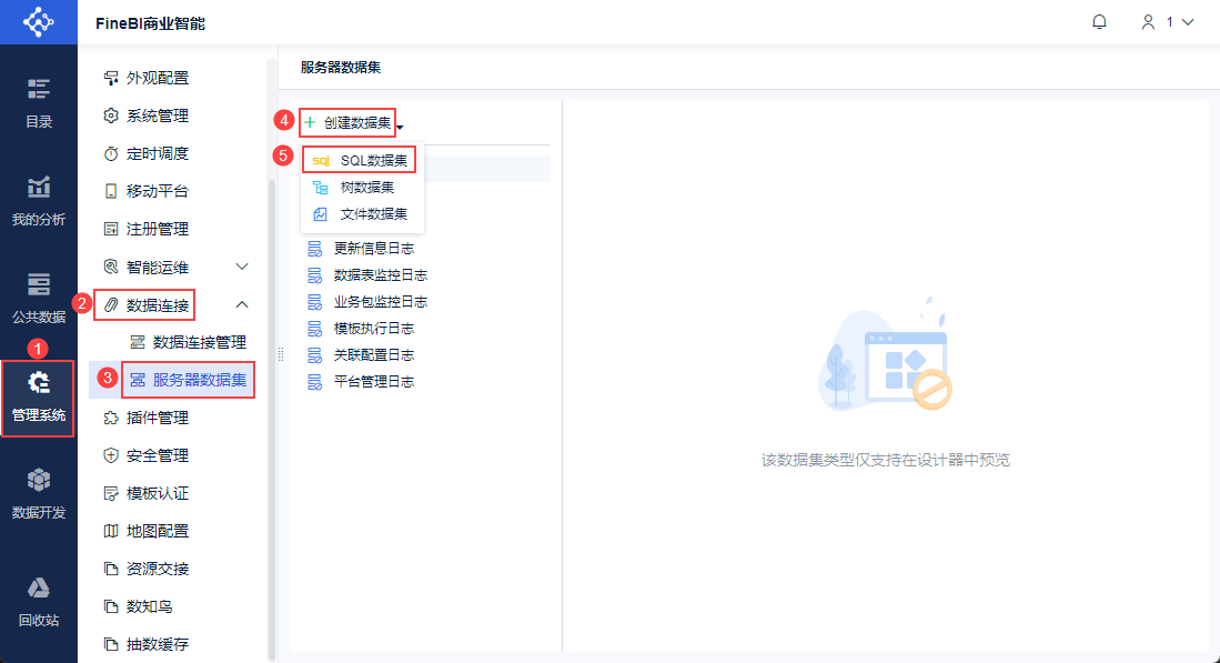 管理员登录FineBI系统,点击「管理系统>数据连接>服务器数据集」,创建「SQL数据集」。如下图所示: