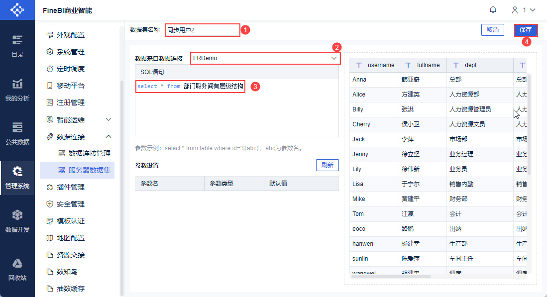 设置数据集名称为「同步用户2」,数据连接选择「FRDemo」,SQL 语句为: