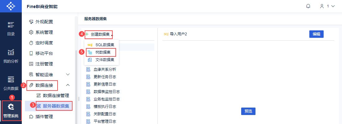 管理员登录FineBI系统,点击「管理系统>数据连接>服务器数据集」,创建「树数据集」。如下图所示: